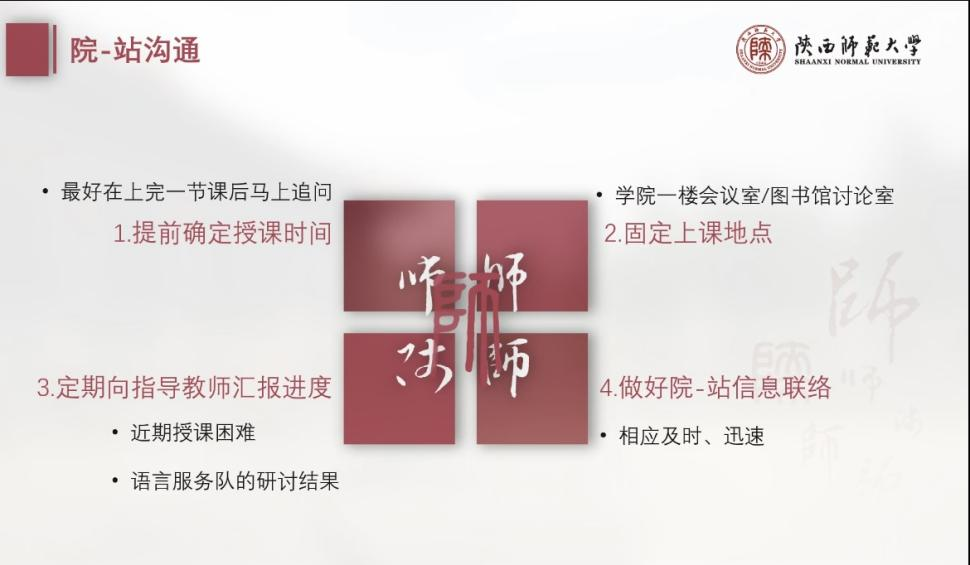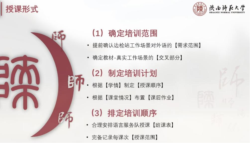 半年多的时间,语言服务队不断发展壮大,MTI中心副主任巢玥先后选拔8位获得教团队格证、英语专业八级证书、全国翻译专业资格考试证书的硕士生以及9位获得教团队格证、英语专业四级成绩达到优秀等次的本科生加入授课队伍。语言服务队授课前需先接受红站语言服务队老队员的培训,形成“老带新”的滚动式语言服务体系,以期建立太阳集团tyc4633服务边疆边检事业的传统。这17名队员思想政治过硬,怀抱教育报国情怀,积极参与集体备课和课后反思,彰显太阳集团tyc4633“红色翻译”和“经典翻译”的学科特色,践行太阳集团tyc4633“红烛苗圃”实践育人品牌项目的核心精神。