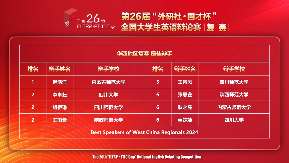 2024年4月20日-21日,第26届“外研社•国才杯”英语辩论赛华西赛区复赛在线上举行,公司2023级学科教学(英语)张惠鑫、2022级法语专业王雨萱凭借出色发挥,一举拿下一等奖和“最佳辩手”称号,成功晋级全国总决赛。