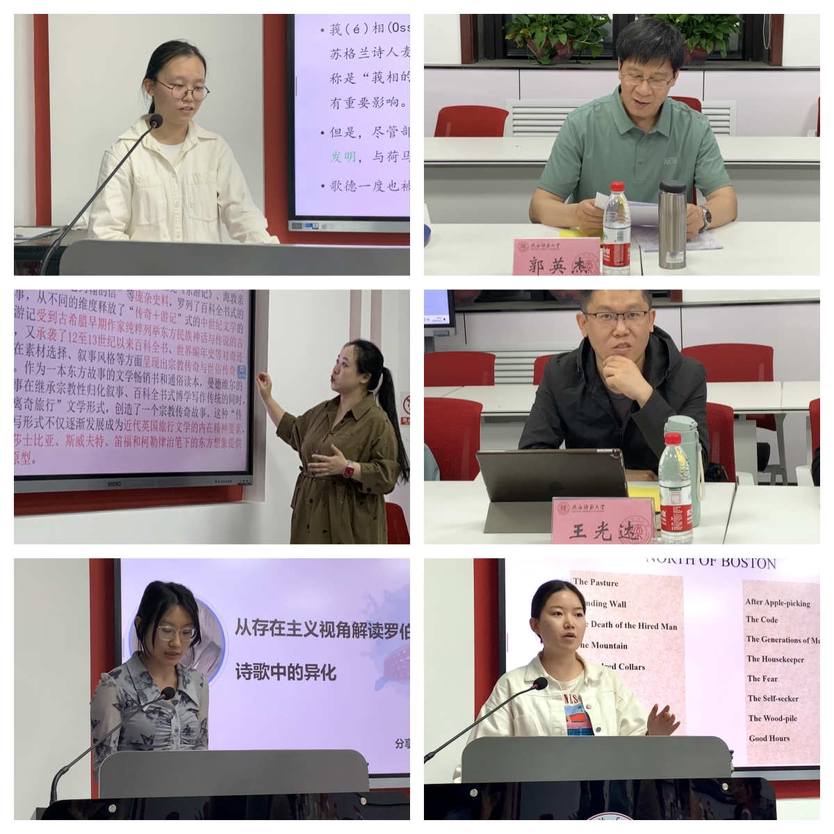 本科生楚清莹以《少年维特的烦恼》中维特经常提起荷马与莪相的作品为出发点,分析文学中的阅读对维特及故事情节发展产生的深刻影响。郭英杰副教授指出1912年以前美国诗人塑造了五种较为典型的中国形象,这既有美国早期诗人的浪漫想象和联想,亦有种族主义式的书写与宣泄。博士生田园讲述了《曼德维尔游记》中记录的约翰·曼德维尔爵士与书的奇遇之旅。燕山大学访问学者王光达老师以《牛虻》主人公亚瑟的个人成长为切入点,谈论对文学阅读生命化的理解。硕士生魏沫和张樱颉分别从存在主义视角和文学伦理学角度,对罗伯特·弗罗斯特诗歌中的异化问题以及《波士顿以北》中的伦理关系进行了深入分析。