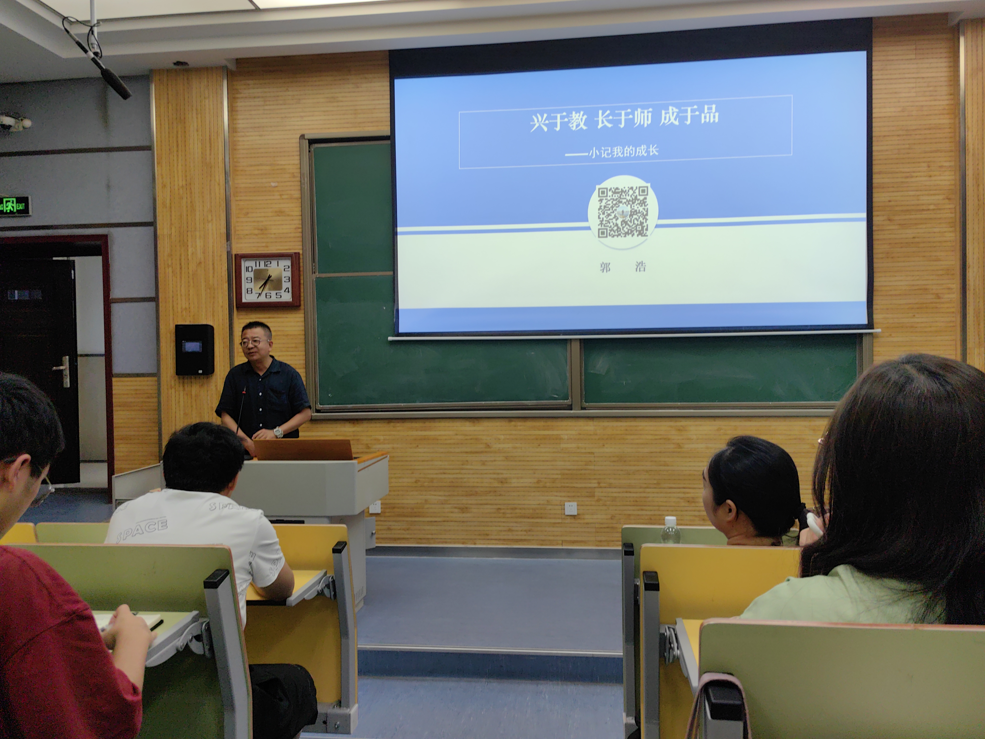 在讲座中,郭浩老师分享了他从一名年轻教师成长为经验丰富的教学名师的心路历程。他强调,教育最重要的不是来自于言传,而来自于身教,时时刻刻保持良好的行为规范,也能够激励自己在工作中充满热情。此外,郭老师细致生动的总结分析了自己在成长和实践过程中遇到的真实问题:如何分析不同年龄阶段员工的心态,如何与员工更好地相处,如何在工作失意时坦然面对,如何平衡家庭与工作。通过大量的教育经验分享和教学实例分析,郭浩老师以幽默诙谐的口吻、深入浅出的方式为师范生同学们打开了正确认识教师职业的大门。最后,郭老师告诉大家,在面对选择、面临困难的时候,应当坚持遵循做一名优秀教师的初心,与员工共同成长,用爱浇灌出和谐共进的良好师生关系。