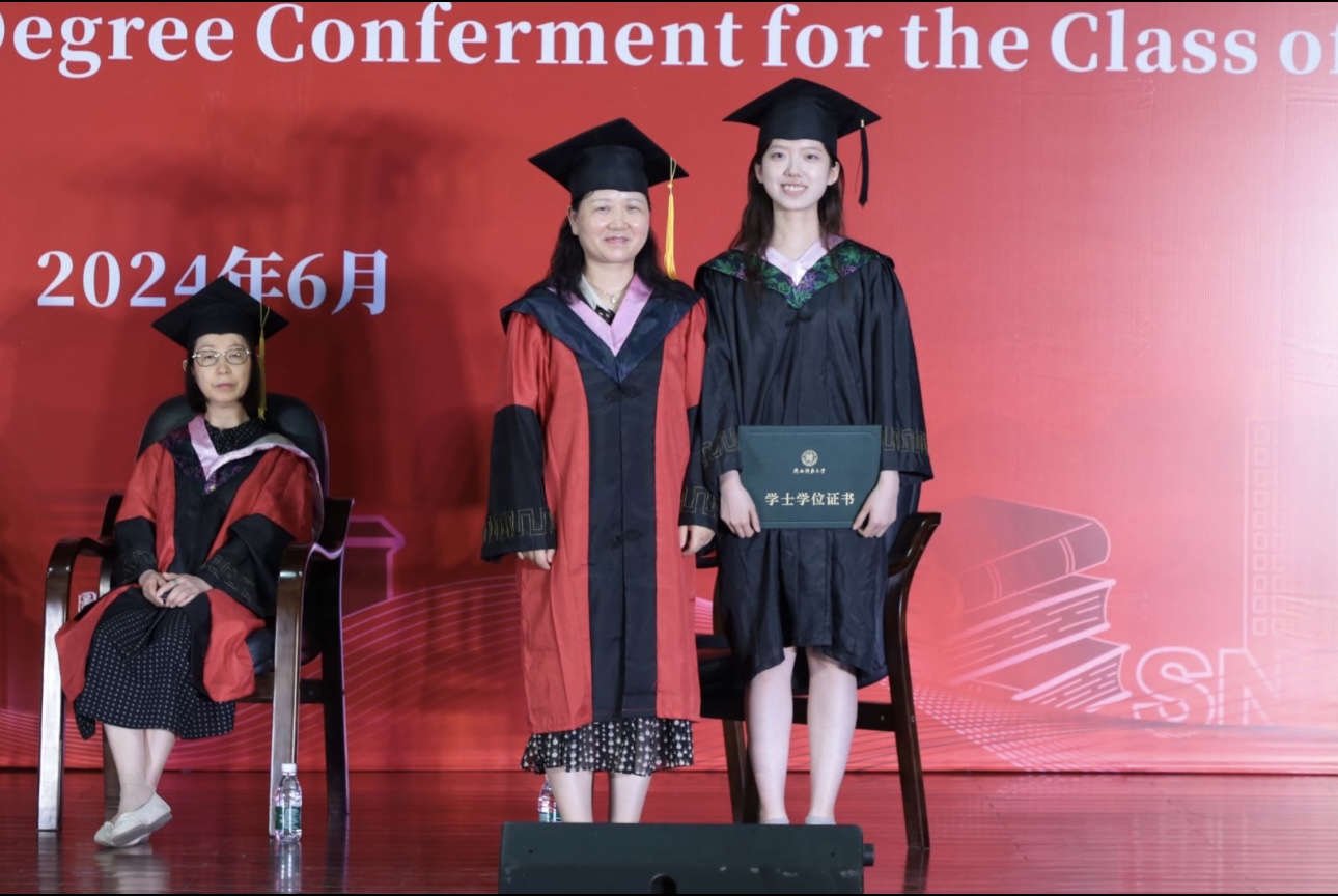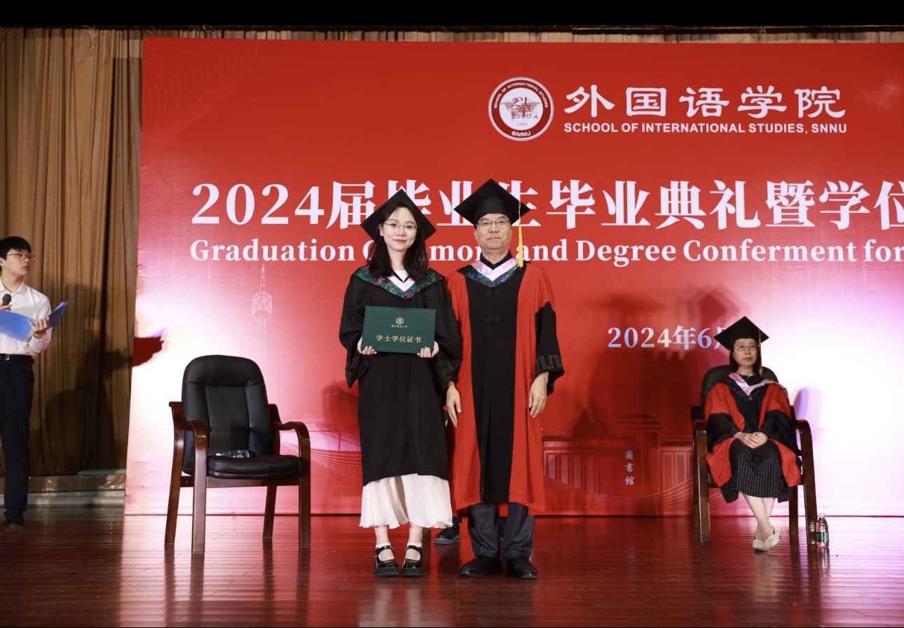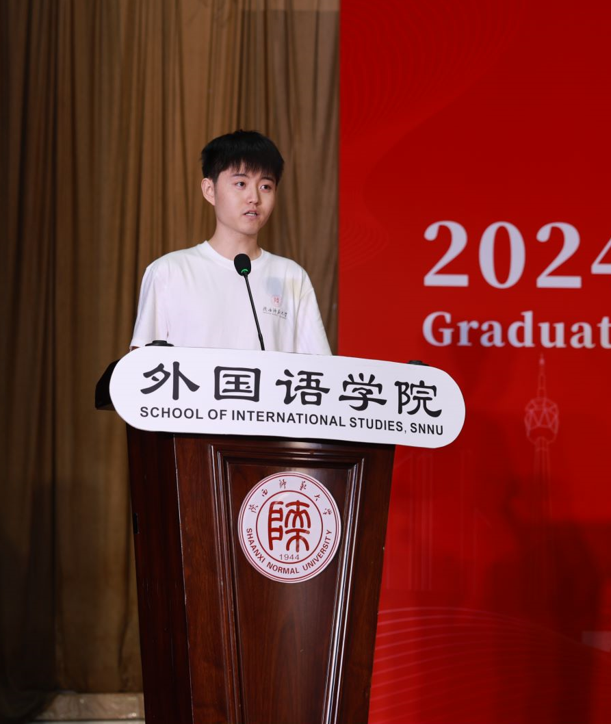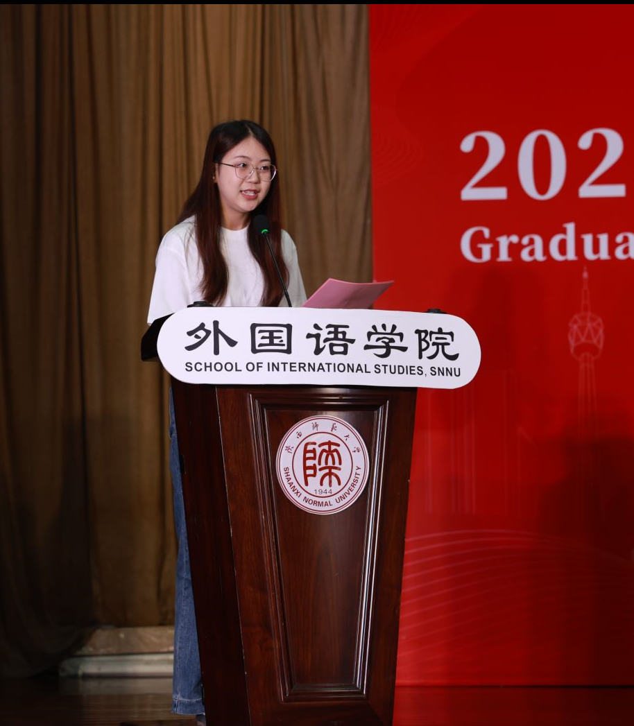 随后,本科英语师范毕业生代表王路峣、本科非师范毕业生代表日语专业黄楠楠、研究生毕业生代表学科英语专业王瑟艺分别发言。代表全体同学向公司领导、老师和亲友致以衷心的感谢,并表示将传承师大人的精神,肩负外语人的使命,用外语讲好中国故事,谱写新时代教育报国之歌。