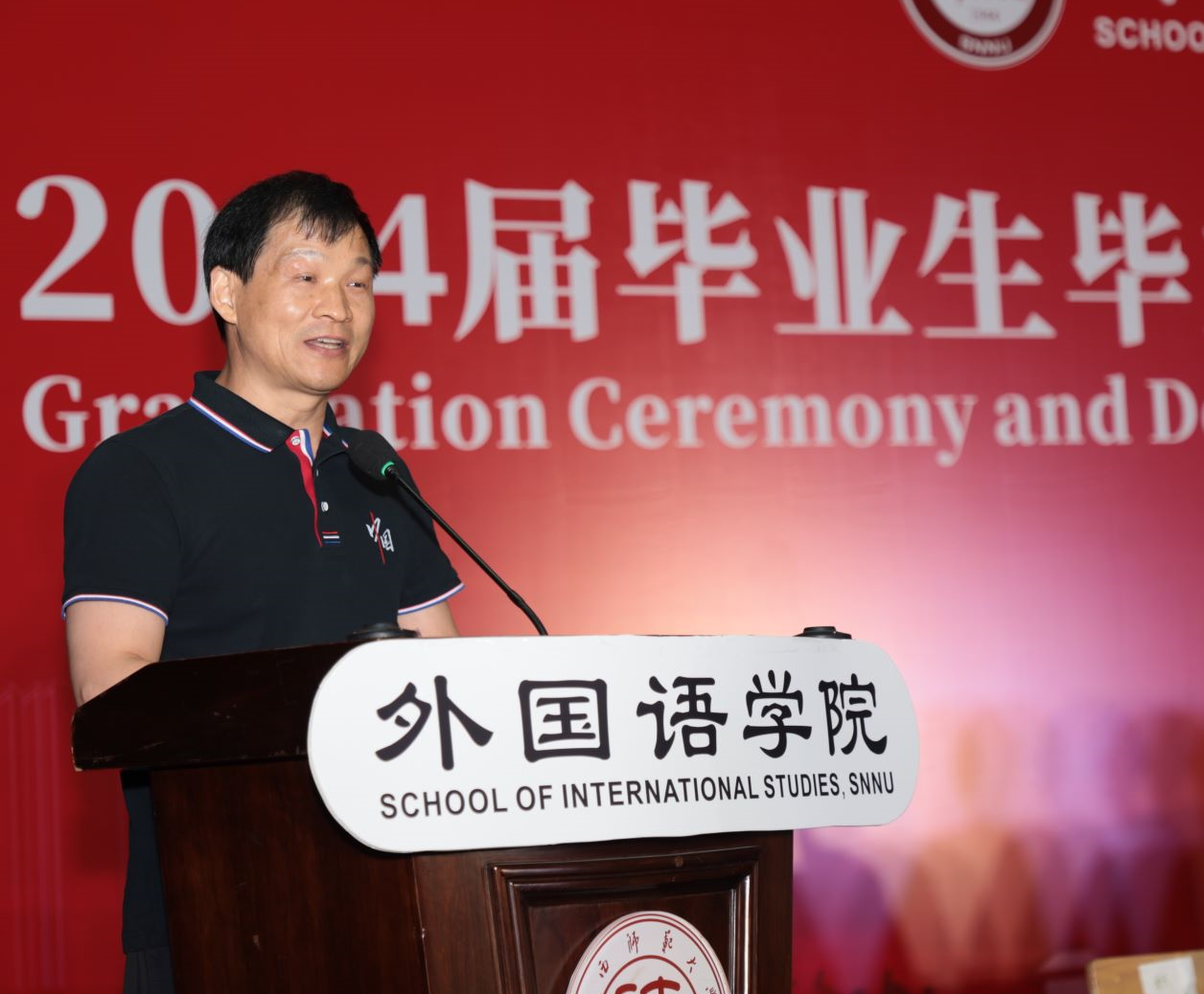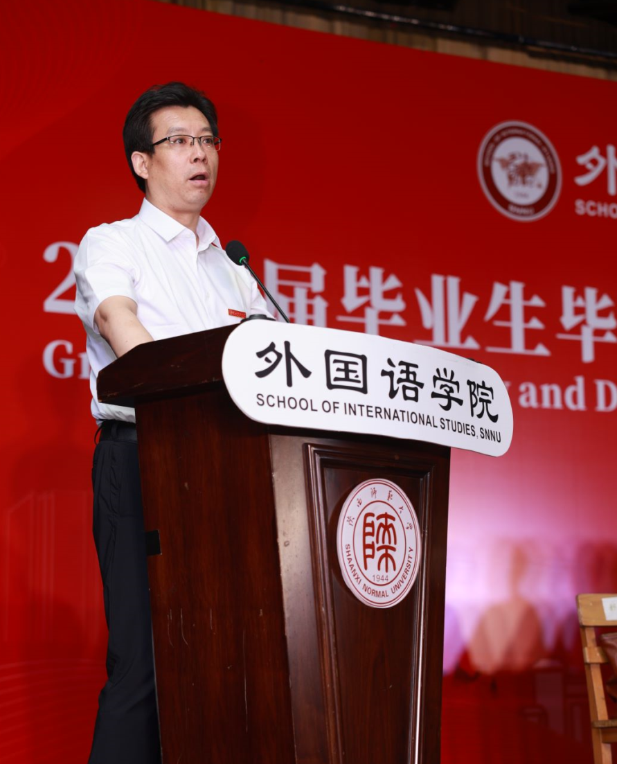 首先,英语系王立永副教授代表全院教师发言。他向全体毕业生表示热烈祝贺,从自己的成长经历寄语毕业生们要怀抱“坚毅、坚定、坚守“勇敢追梦,并与同学们立下二十年之约。