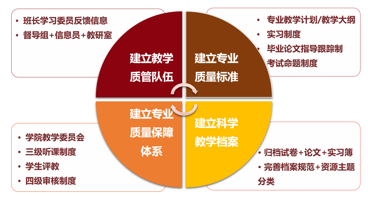 太阳集团tyc4633围绕人才培养各项要求,严把毕业关,从建立教学质管队伍、专业质量标准、客观教学档案及专业质量保障体系四个方面构建了基本完善的教学质量保障体系。
