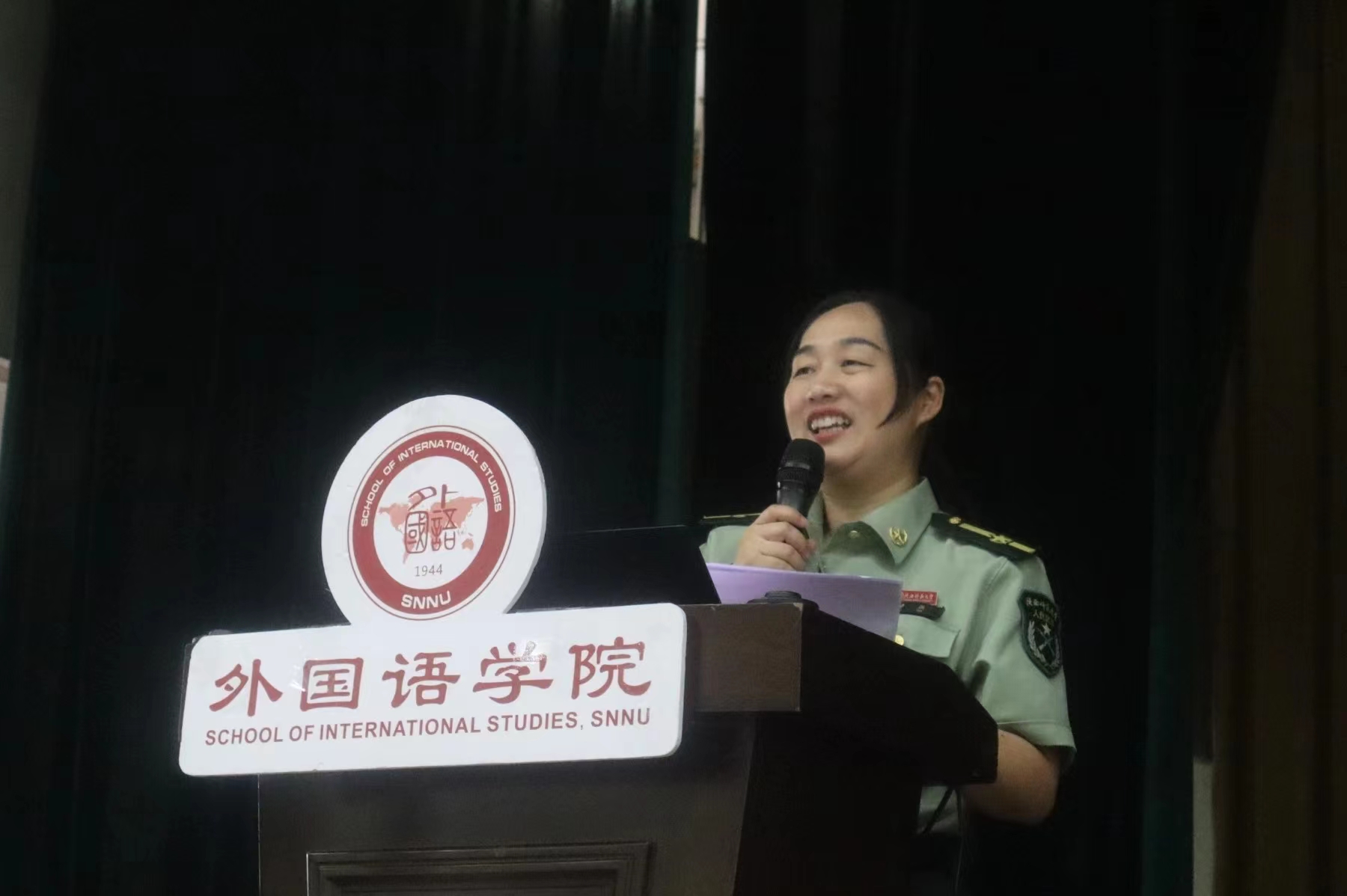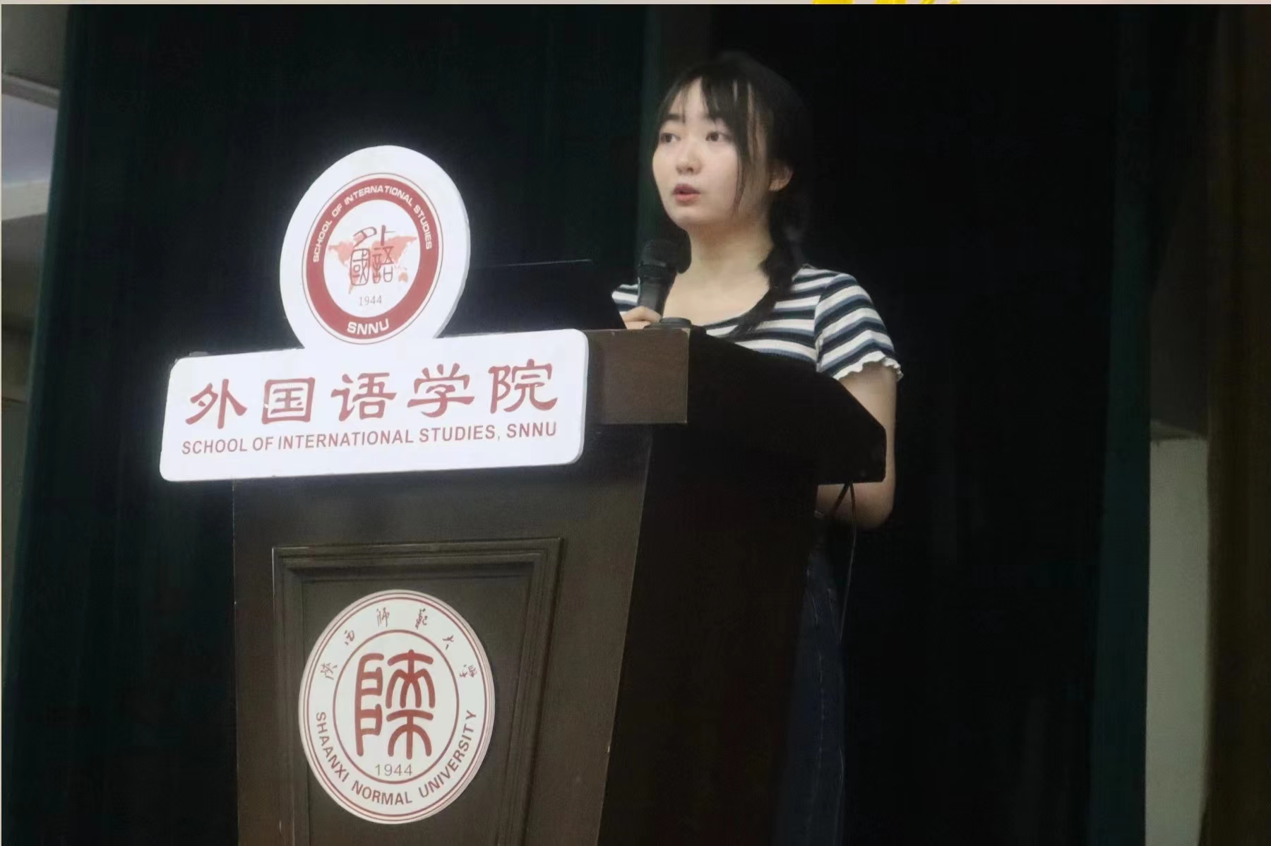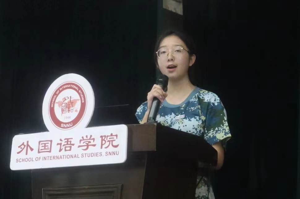 研究生在校代表2023级笔译班陈昭蓉发言。她特别强调了导师在研究生阶段教育中的核心地位,鼓励每位新生都要珍惜与导师相处的机会,积极主动地向导师请教。勉励大家要有勇气面对一切未知与挑战,始终保持乐观的态度。