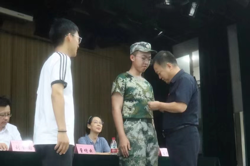 公司党委书记董增云为本科生、研究生新生代表们佩戴校徽,勉励新同学们牢记厚德、积学、励志、敦行的校训。