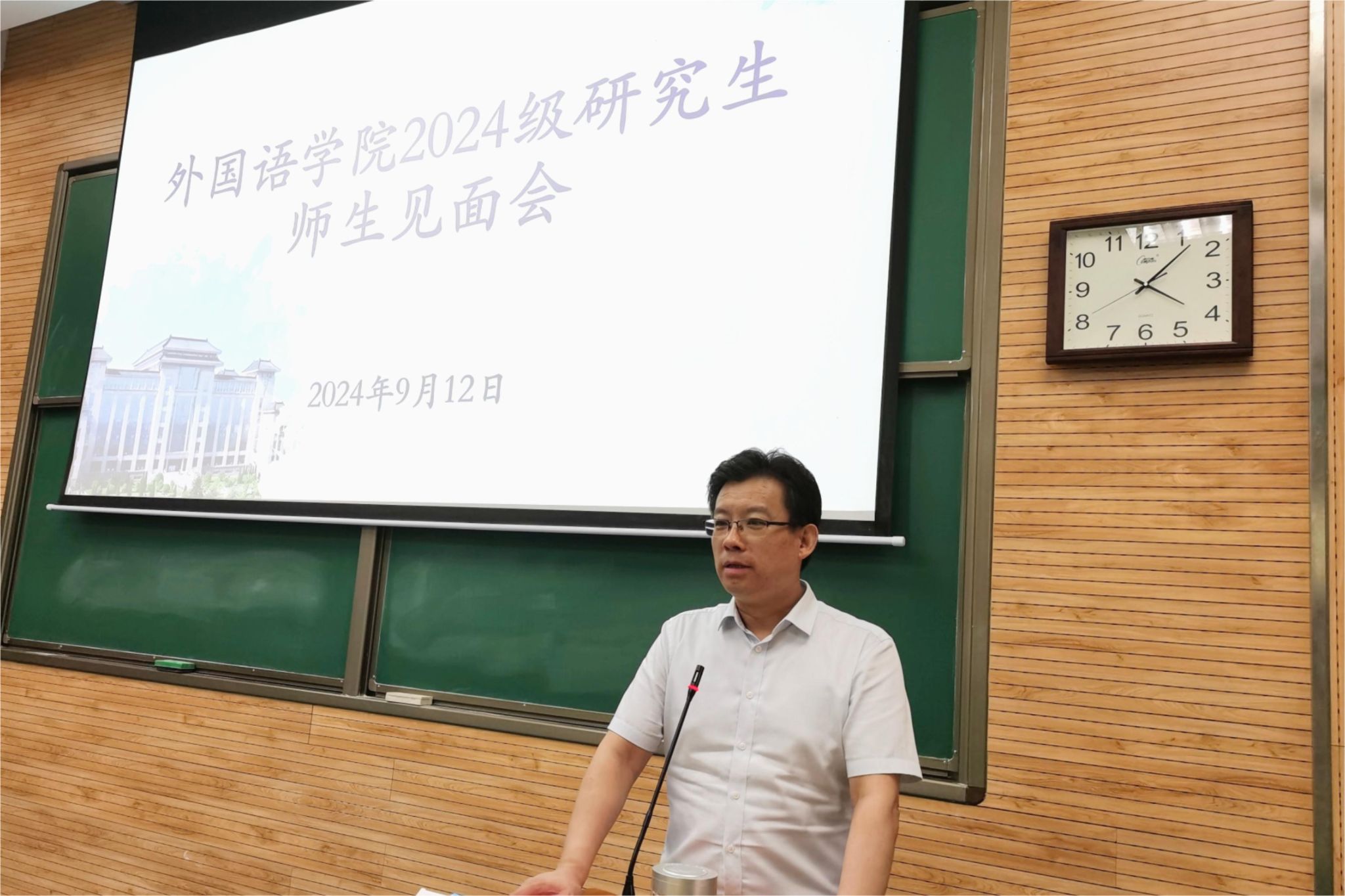 2024级研究生导师代表郭英杰副教授引经据典,鼓励同学们明确研究生阶段的目标,不断提升思想境界,做纯粹高尚、怀揣梦想的人。“再进再困,再熬再奋,自有亨通精进之日”,他希望同学们不断历练,努力做博艺人、多语人、教育人、国际人、研究人五位一体的外语全人。