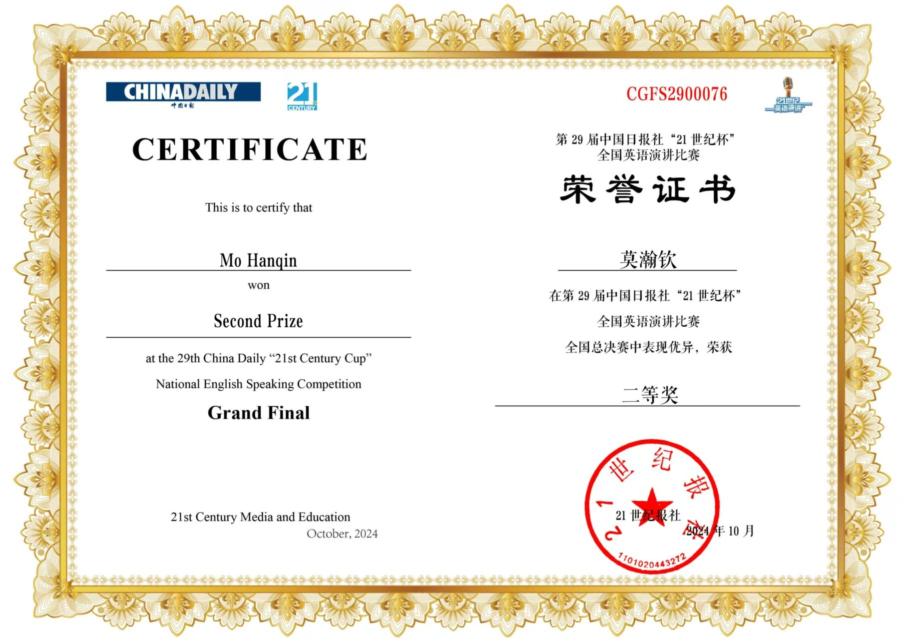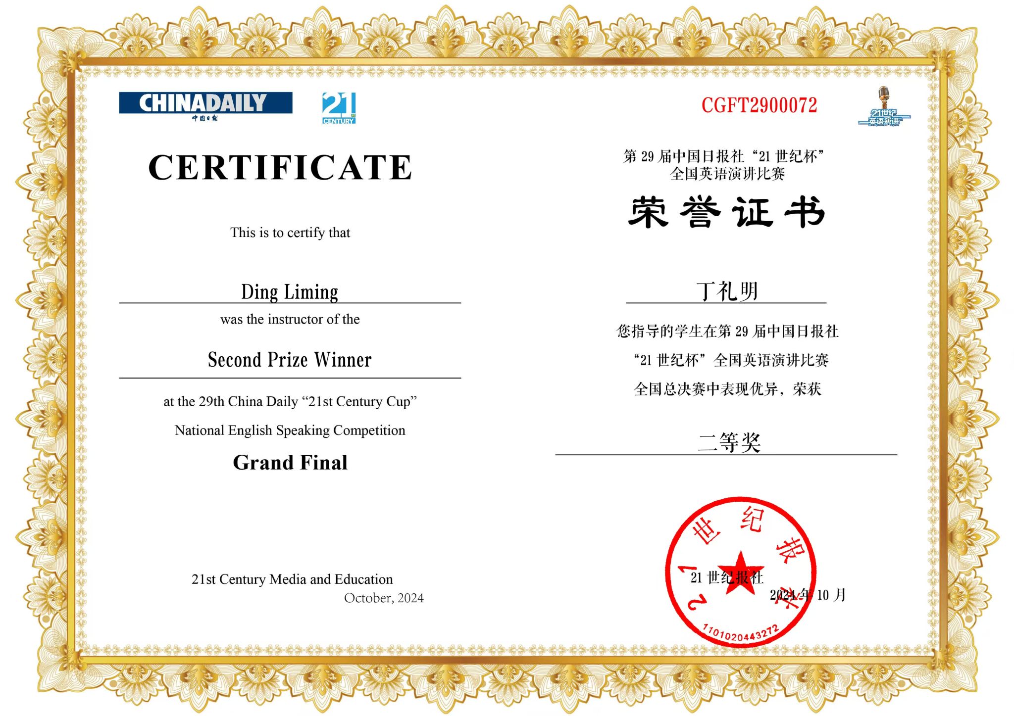 2024年10月17日至10月21日,由中国日报社、21世纪英语教育传媒承办的第29届中国日报社“21世纪杯”全国老员工英语演讲比赛全国赛在江苏无锡落下帷幕。全国总决赛共有来自各个省级赛区的246名选手。在经过5天、三轮的激烈比拼后,太阳集团tyc4633英语系2023级英语师范专业莫瀚钦同学获得全国二等奖,太阳集团tyc4633英语系丁礼明老师获得优秀指导教师奖。此次获奖也是老员工TOP外语成长训练营的阶段成果。