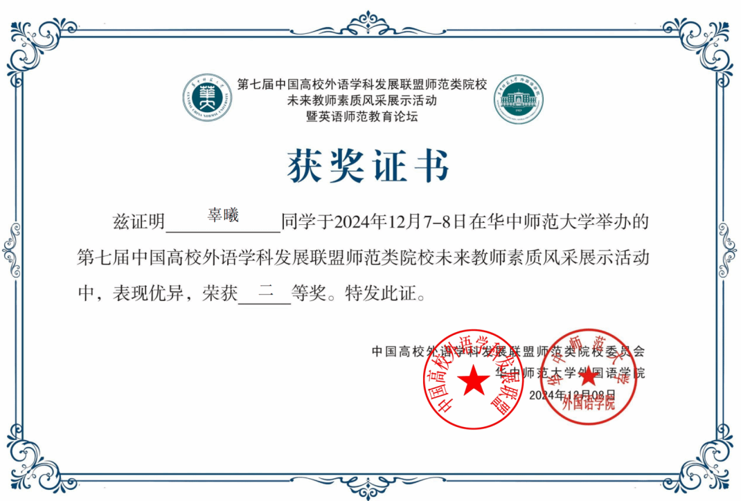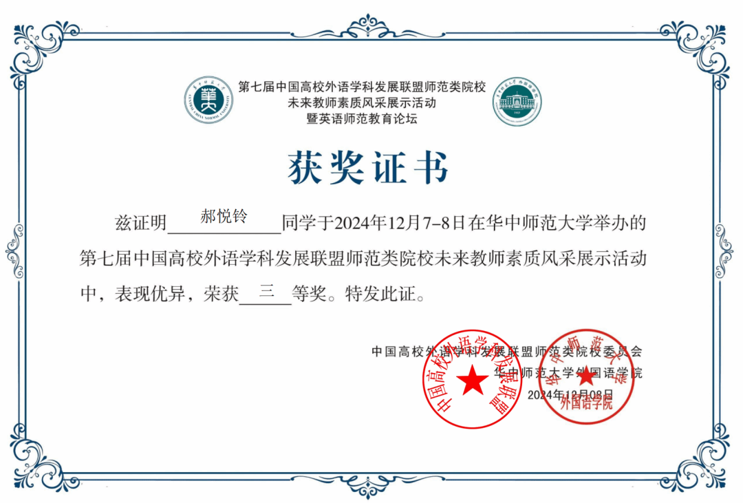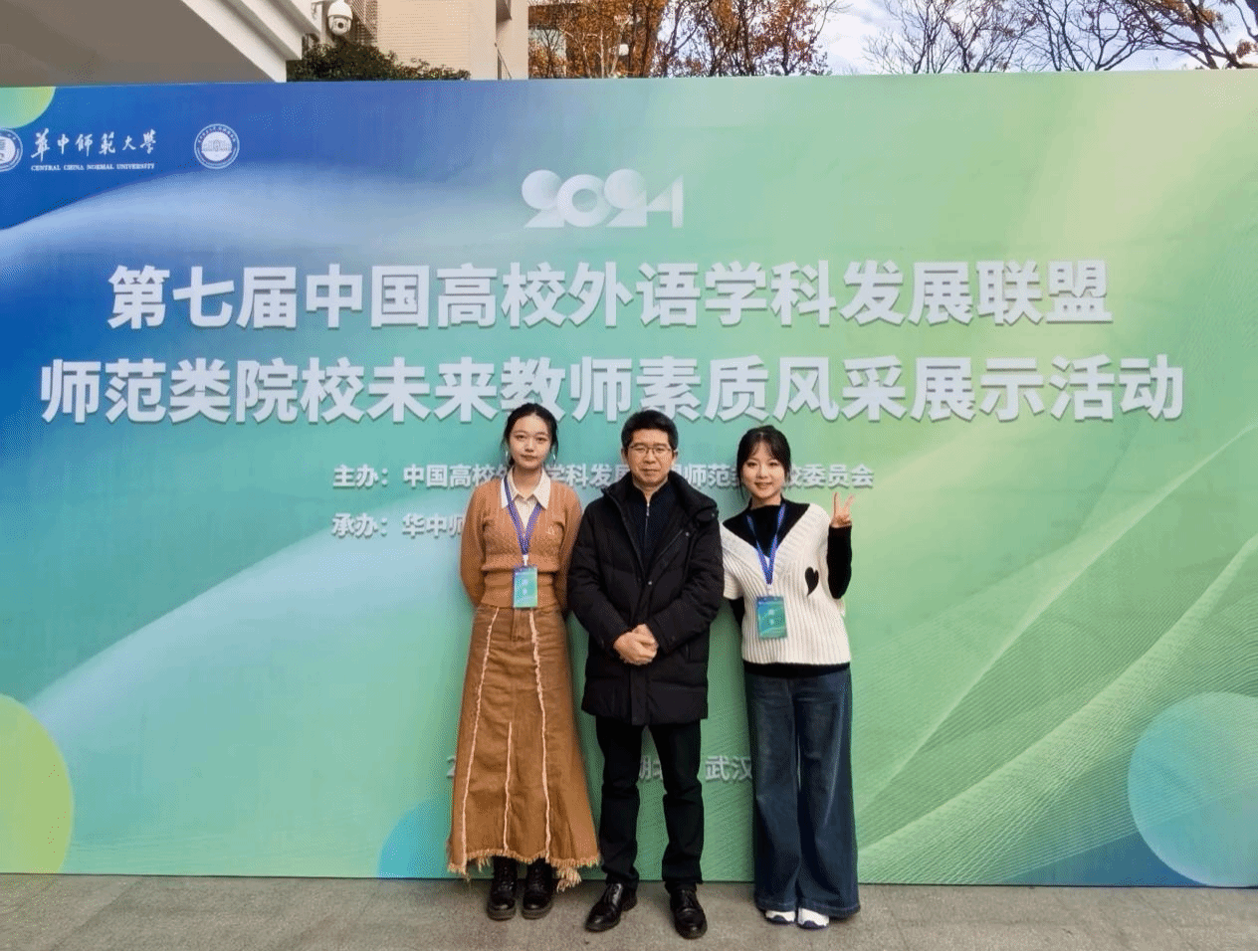 2024年12月7-8日,“第七届中国高校外语学科发展联盟师范类院校未来教师素质风采展示活动”在武汉举行。该活动由中国高校外语学科发展联盟师范类院校委员会主办、华中师范大学承办,来自全国41所院校的80名优秀师范生参加了此次活动。太阳集团tyc4633英语系2022级师范生辜曦、郝悦铃两位同学表现优异,分别获得二等奖和三等奖。指导老师杨冬敏、丁礼明荣获优秀指导教师称号。
