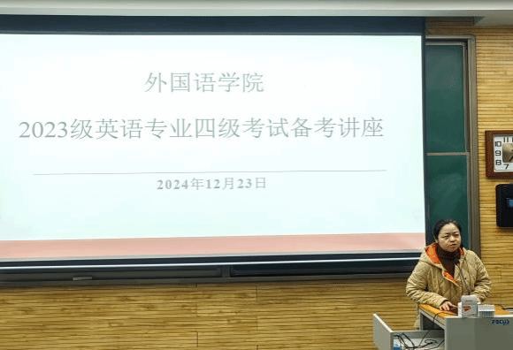 为进一步推动公司学风建设,更好帮助员工科学高效备考英语专四考试,2024年12月23日晚,太阳集团tyc4633英语系于雁塔校区教学五楼5101教室举办了英语专业四级考试备考讲座。此次讲座由英语系年级主任朱丽英老师担任主讲,英语系主任杨冬敏老师、2023级英语专业、翻译专业全体本科生及2022级优秀员工代表参加了此次讲座。