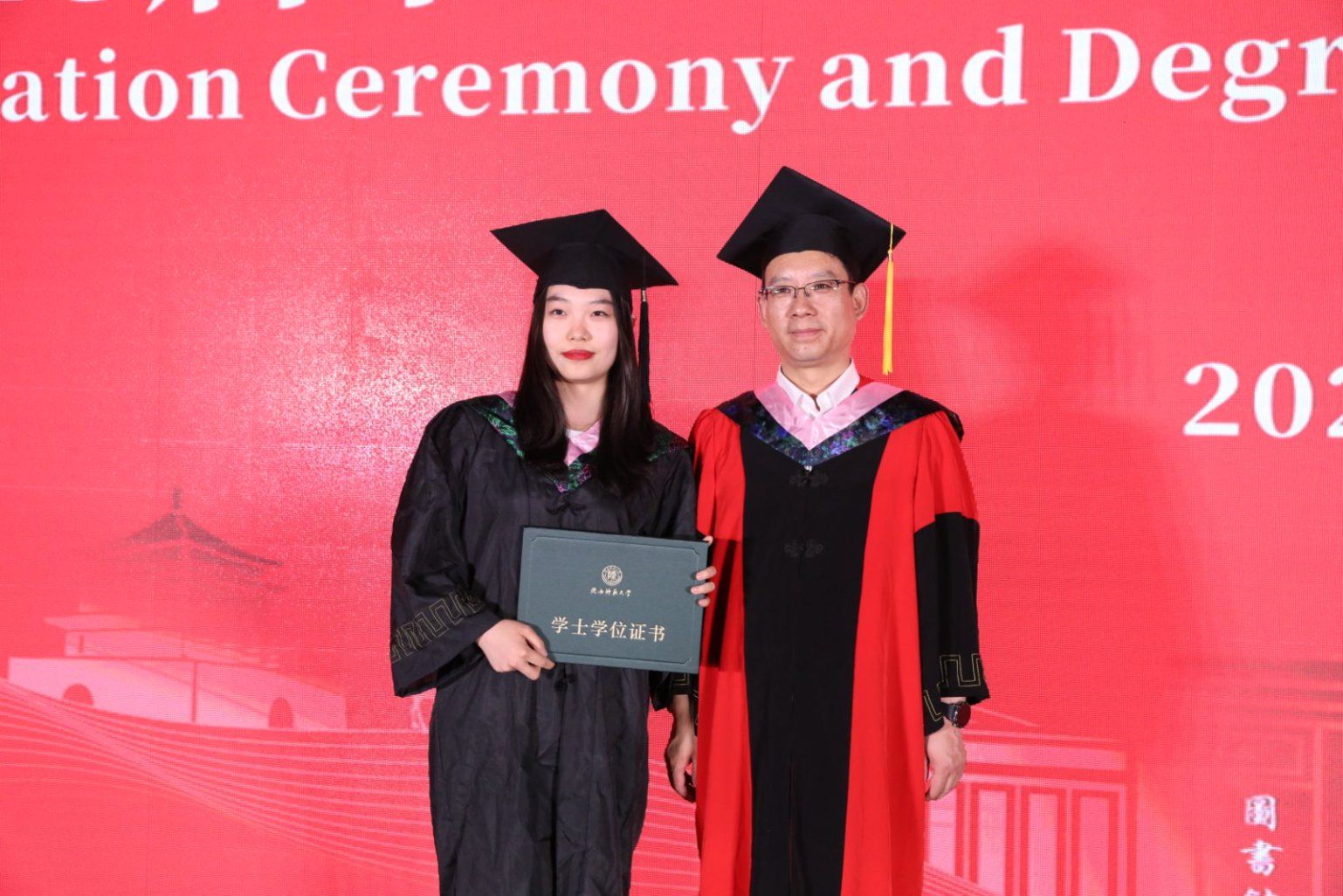 公司教师代表、法语系乔溪老师发言。她向全体毕业生表示热烈祝贺,并借用古希腊的传奇故事告诉大家,要有勇气、有谋略、有见地、有胆识,在人工智能蓬勃发展的时代,以外语人的专业素养,保持开放的心态,打开新世界的大门。