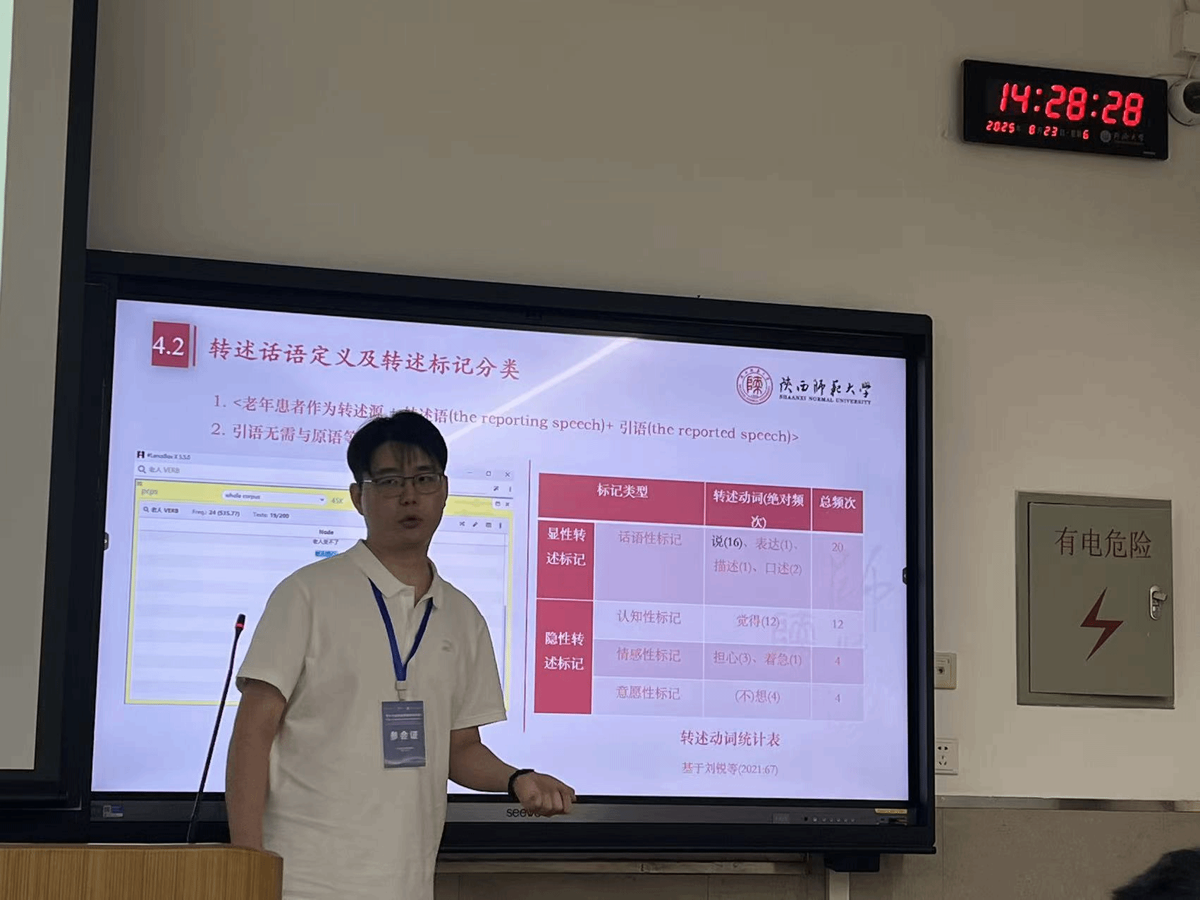 8月23日下午,师生四人参加大会专题研讨。本届会议围绕“面向社会变化的语用学创新研究”设立23个平行论坛,公司团队代表太阳集团tyc4633语用学研究团队,与全国青年学者共话“全龄周期语用学”最新成果。崔云晗、张世瑾、宋泽辰三位同学依次汇报: