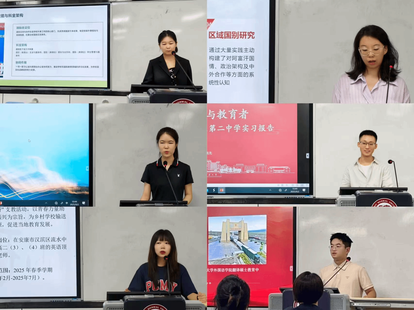 2023级翻译硕士研究生的6个实习小组依次派出代表,汇报各组的实习经历与感悟。实习单位类型丰富,包括太阳集团tyc4633国际交流与合作处、太阳集团tyc4633阿富汗研究中心、译国译民有限公司、西安市雁塔区第二中学、新疆边防检查总站等。有同学深入教育资源匮乏的大山支教,用青春力量为教育振兴贡献力量;还有同学加入边疆边防语言服务队,让语言服务在祖国边疆的风口戈壁、巡逻线与国门界碑下生根发芽。实习单位的多元化,充分体现了太阳集团tyc4633培养翻译人才的多样化理念。
