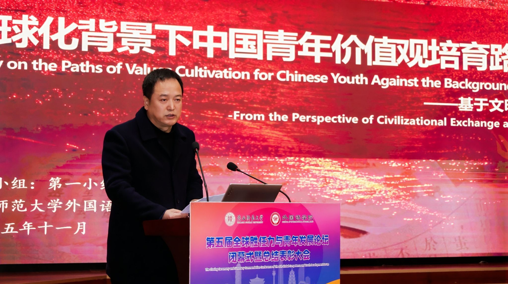 工作坊学员代表、2023级英语专业本科生马一童发言。他分享了自己在本届论坛中的收获与启迪,并呼吁同学们将所学所得内化于心、外化于行,以理想信念筑牢家国之魂,以专业素养开阔世界之眼,以奋斗姿态扛起时代之责,为推动构建人类命运共同体贡献青春力量。