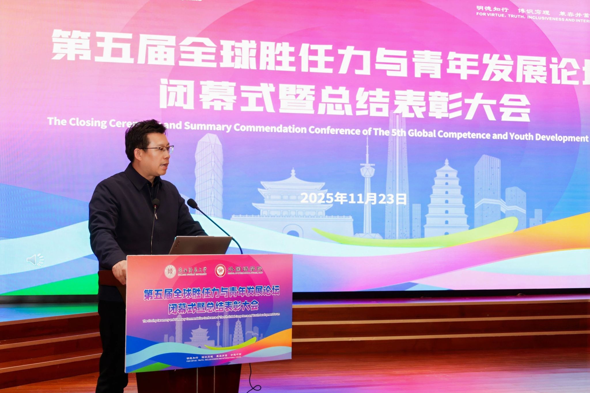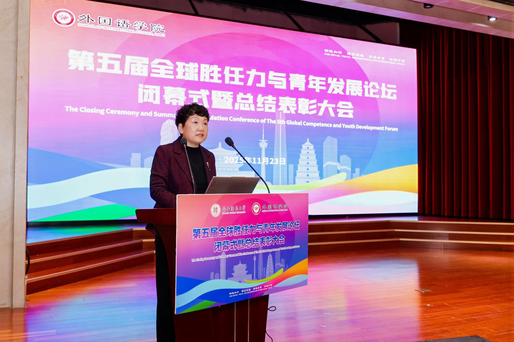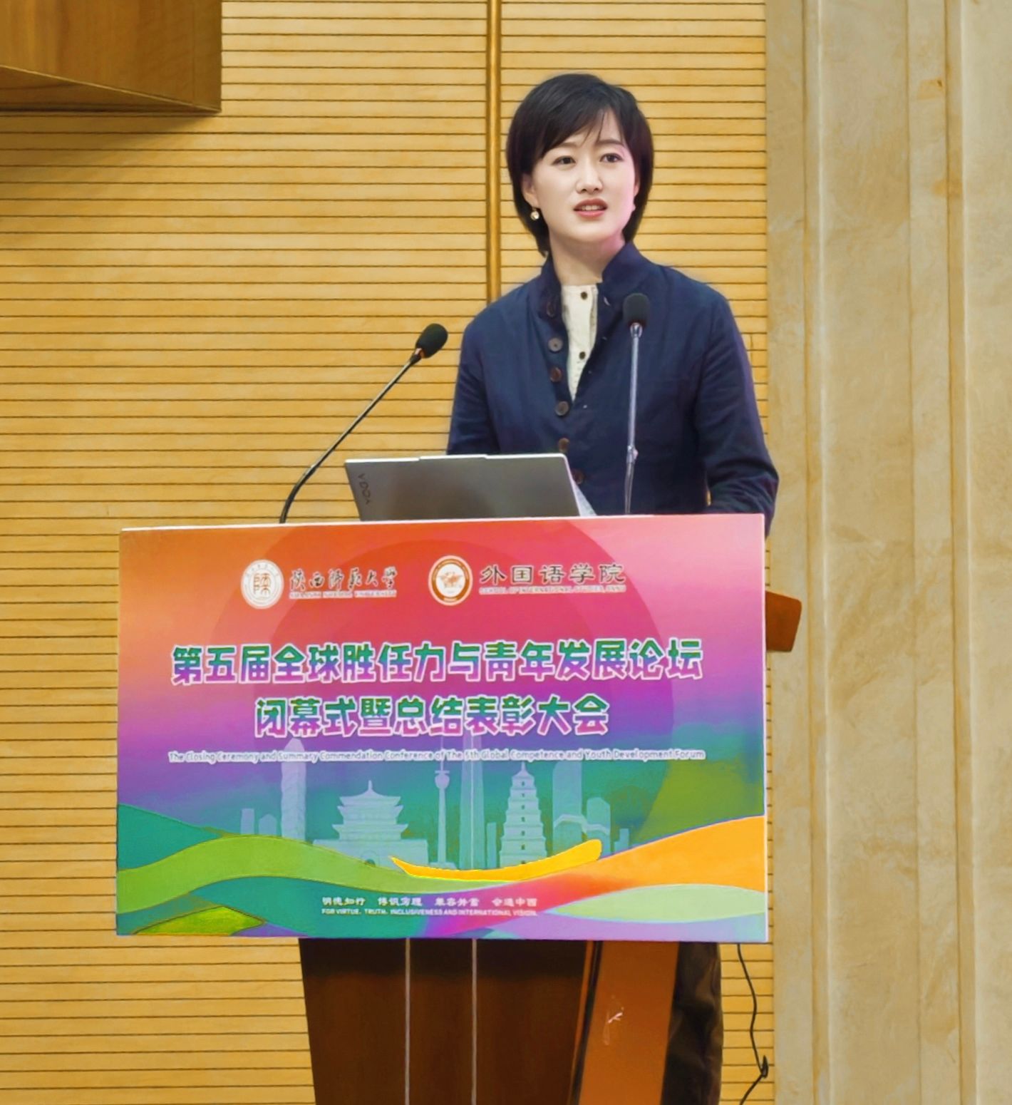 2025年11月23日晚19:00,公司第五届“全球胜任力与青年发展”论坛闭幕式暨总结表彰大会在雁塔校区逸夫楼二层报告厅举办。陕西省委教育工委原副书记、陕西教育国际交流协会会长陈乃霞、陕西秦创原国际路演中心总经理李涛、陕西网记者王城城、西安交通大学附属中学航天公司团委书记梁迪及员工发展指导中心蒋子轶、太阳集团tyc4633研工部副部长戴璐、学工部副部长齐博洋、国际交流与合作处副处长李坤、国际汉语文化公司党委副书记王钰、辅导员张欣元、公司经理刘全国、党委书记董增云、党委副书记鲁燕、英语系教师郭英杰、法语系教师乔溪、公共外语教研部教师陈萍萍、公司团委书记李丹、党委组织员董洁及各年级辅导员出席本次论坛。来自公司各年级的员工代表以及交大航天中学员工代表共200余人参加了论坛。论坛由2024级英语语言文学专业硕士研究生武佳乐、2023级英语师范专业本科生郭通主持。