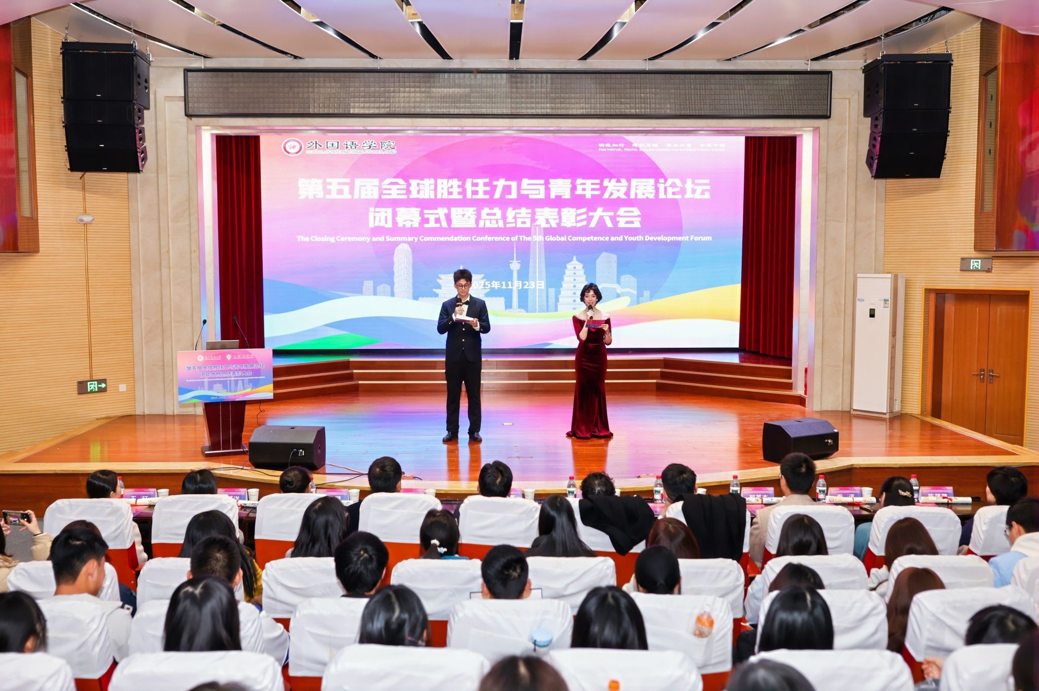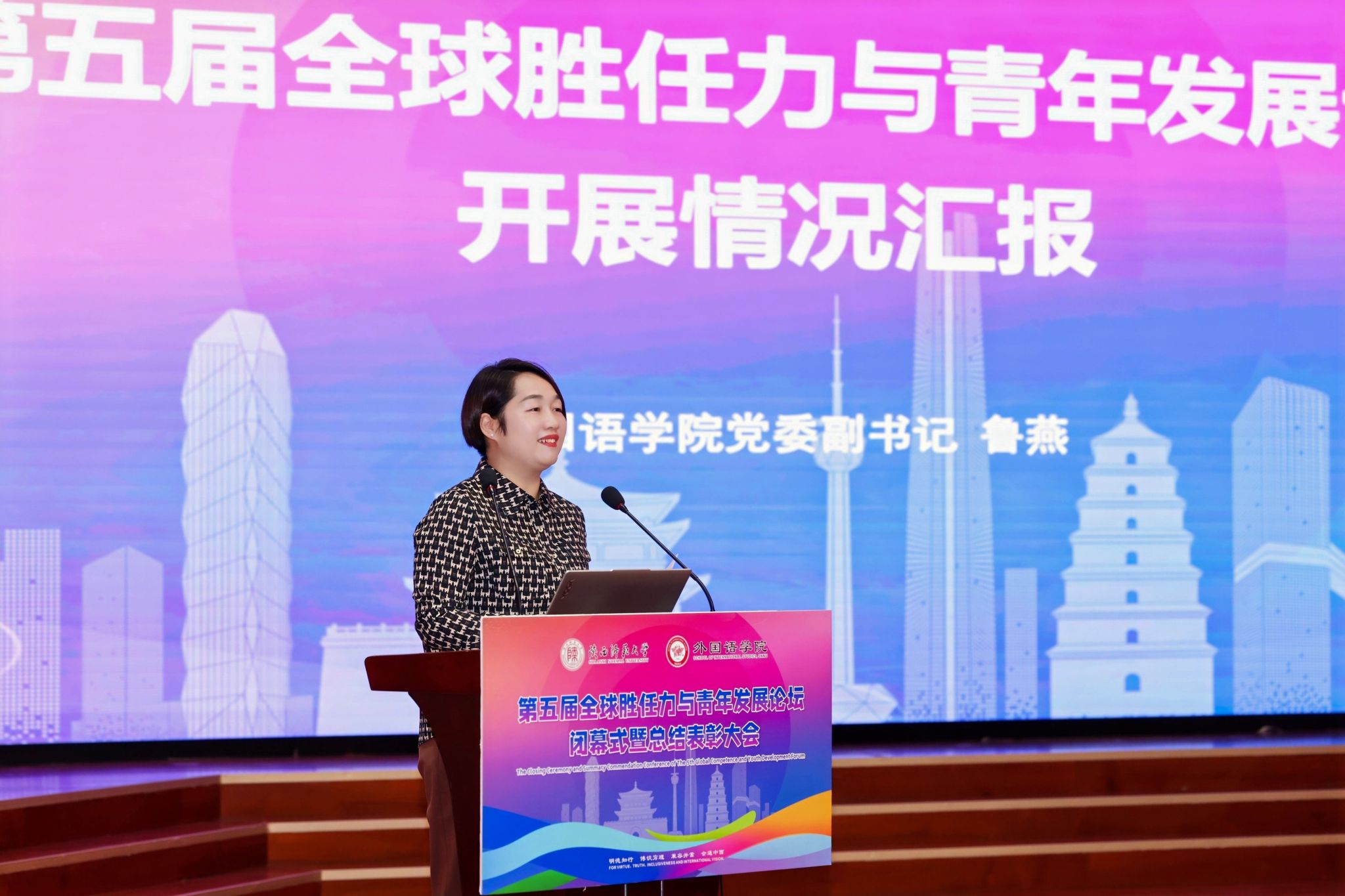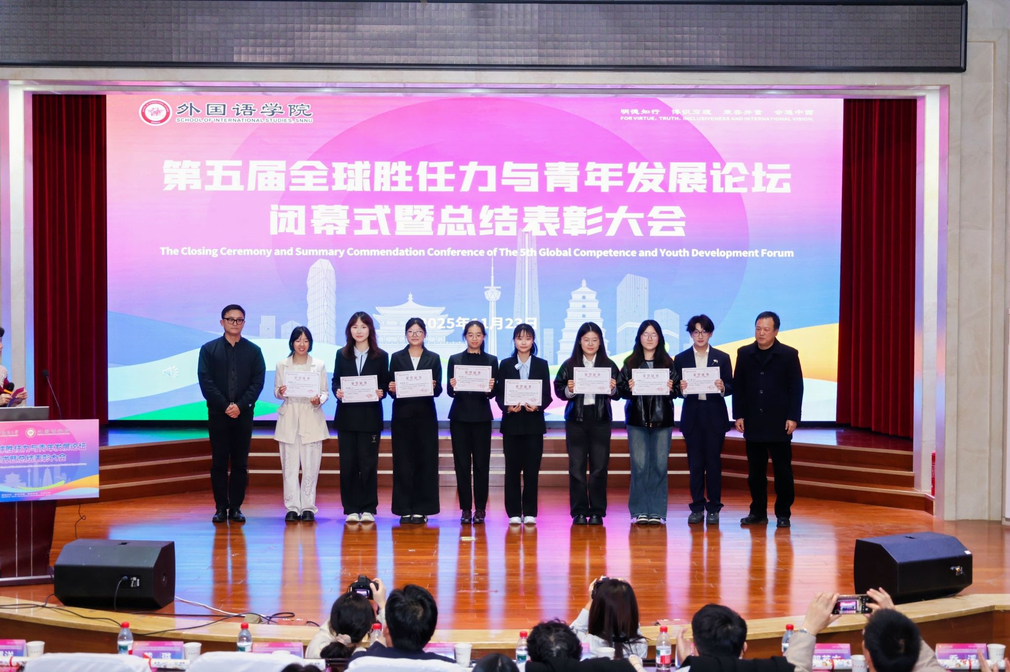 2025年11月23日晚19:00,公司第五届“全球胜任力与青年发展”论坛闭幕式暨总结表彰大会在雁塔校区逸夫楼二层报告厅举办。陕西省委教育工委原副书记、陕西教育国际交流协会会长陈乃霞、陕西秦创原国际路演中心总经理李涛、陕西网记者王城城、西安交通大学附属中学航天公司团委书记梁迪及员工发展指导中心蒋子轶、太阳集团tyc4633研工部副部长戴璐、学工部副部长齐博洋、国际交流与合作处副处长李坤、国际汉语文化公司党委副书记王钰、辅导员张欣元、公司经理刘全国、党委书记董增云、党委副书记鲁燕、英语系教师郭英杰、法语系教师乔溪、公共外语教研部教师陈萍萍、公司团委书记李丹、党委组织员董洁及各年级辅导员出席本次论坛。来自公司各年级的员工代表以及交大航天中学员工代表共200余人参加了论坛。论坛由2024级英语语言文学专业硕士研究生武佳乐、2023级英语师范专业本科生郭通主持。
