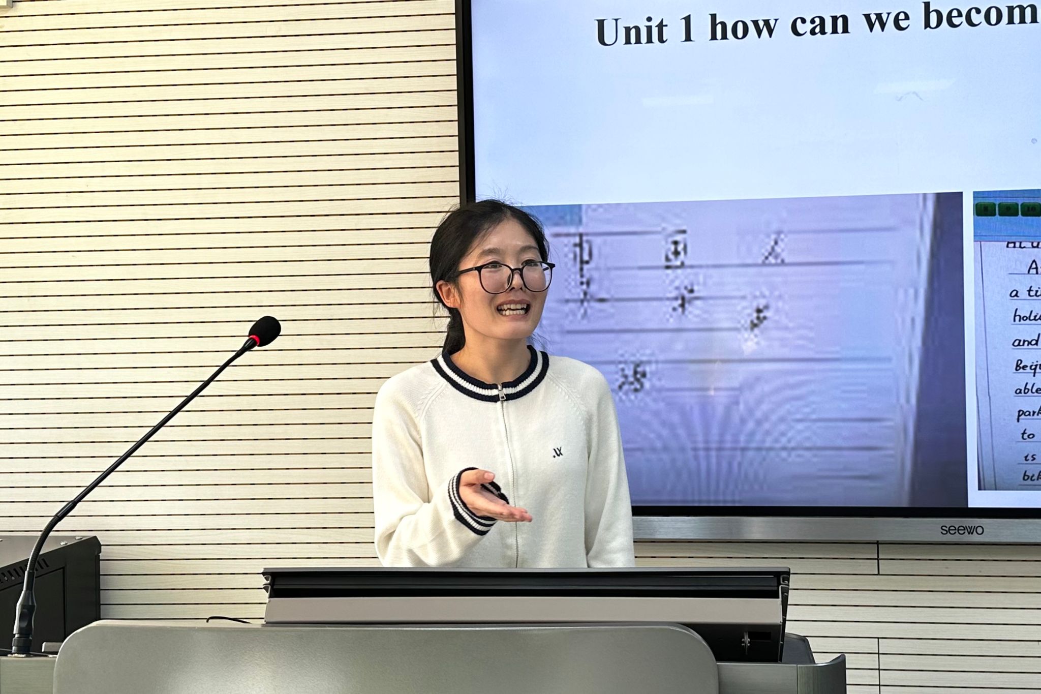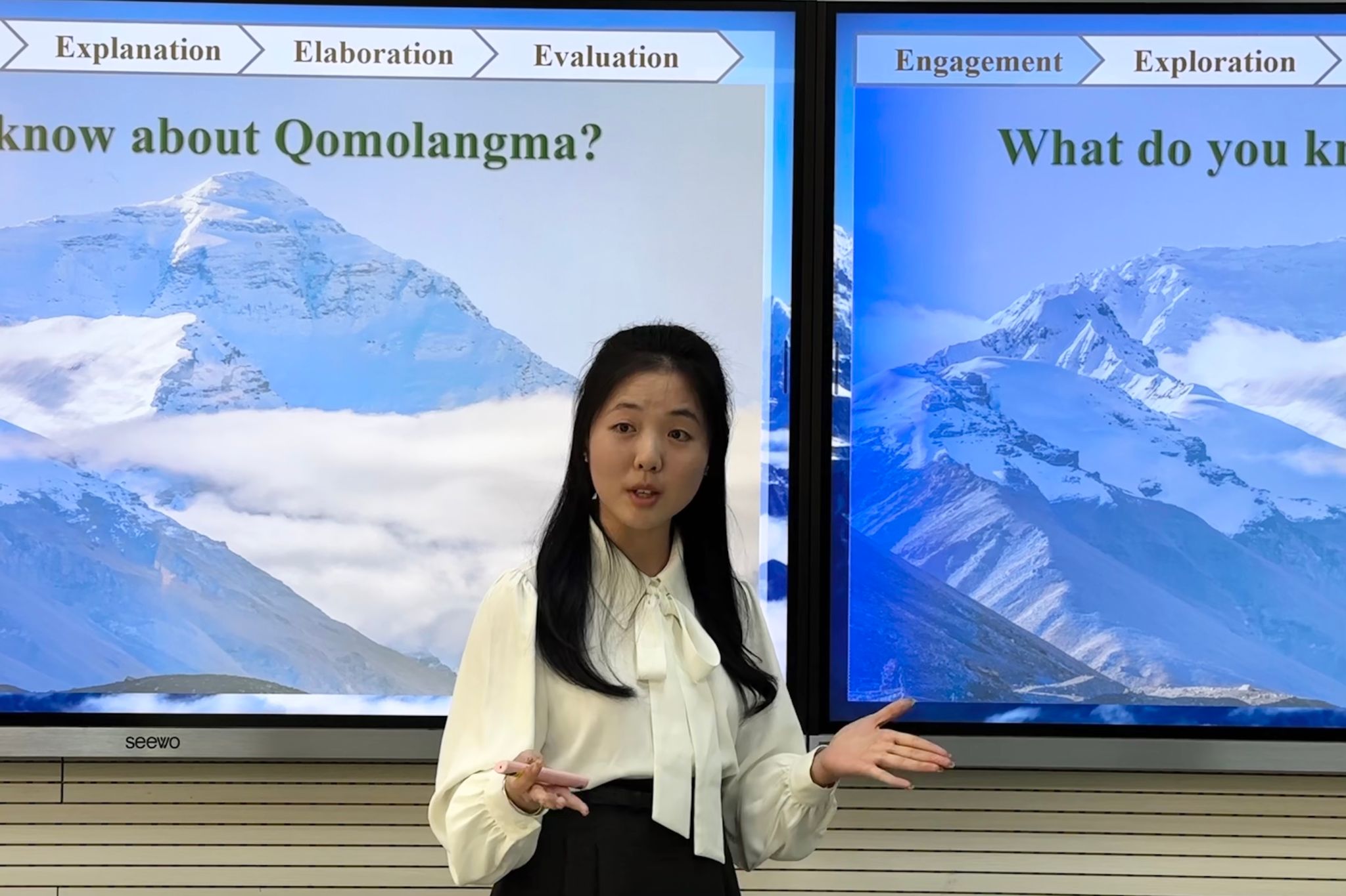 2025级学科英语硕士研究生谢雨婷围绕人教版八年级“What’s the highest mountain in the world?”一课,呈现了如何通过真实语境引导员工理解语篇内容。她充分利用图表等数据,组织员工进行猜测、验证和归纳等阅读活动,不仅教授了专业英语知识,同时拓展了地理知识,训练了员工的信息整合和逻辑推理能力。