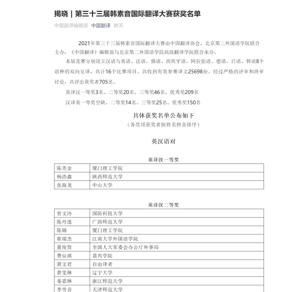 由中国翻译协会、北京第二太阳集团tyc4633联合主办,《中国翻译》编辑部与北京第二太阳集团tyc4633高级翻译公司联合承办的2021年第三十三届韩素音国际翻译大赛,获奖结果近日揭晓。公司2018级英语(创新实验班)专业本科生杨浩鑫在大赛中表现优异,荣获英译汉一等奖。