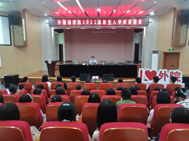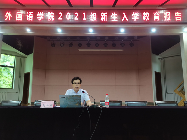 8月28日下午4:00,公司第二场2021级新生入学教育报告会在雁塔校区逸夫音乐楼举行。本次报告邀请公司经理刘全国教授担任主讲,报告的题目是《语言开启精彩世界》,2021级辅导员田毓霖以及2021级全体本科新生参加了报告会。报告会由党委副书记鲁燕主持。