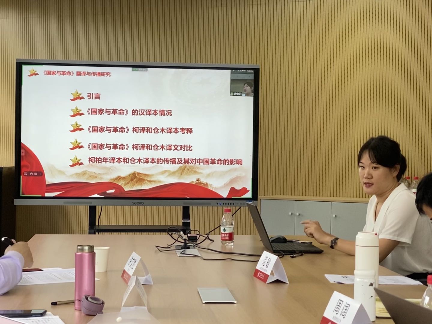 2020级外国语言文学专业国别与区域研究方向博士研究生周阔同学在大会分论坛的小组讨论中进行了发言,向大家介绍了《国家与革命》柯柏年和仓木译本对比研究情况。