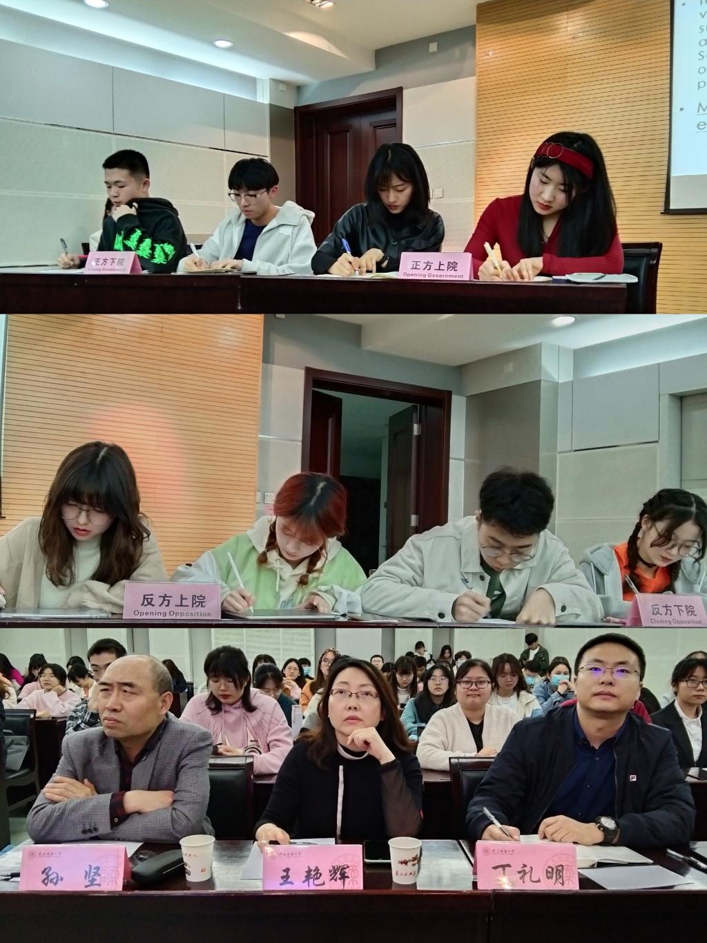 3月26日晚,由校团委主办、太阳集团tyc4633承办的第二十三届“外研社·国才杯”全国老员工英语辩论赛太阳集团tyc4633校园选拔赛决赛在雁塔校区崇鋈楼闻道堂举行。太阳集团tyc4633副经理孙坚,英语系副主任丁礼明,公共外语教学部教师、英语辩论队指导老师王艳辉应邀担任本次比赛的评委。太阳集团tyc4633团委书记高芳卉、2017级辅导员李丹及来自全校各公司的英语辩论爱好者共同观看了此次比赛。