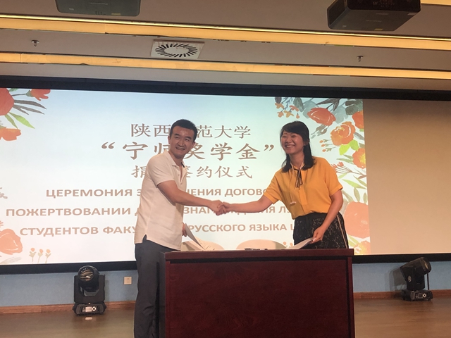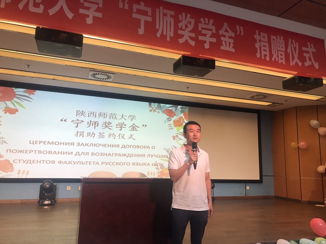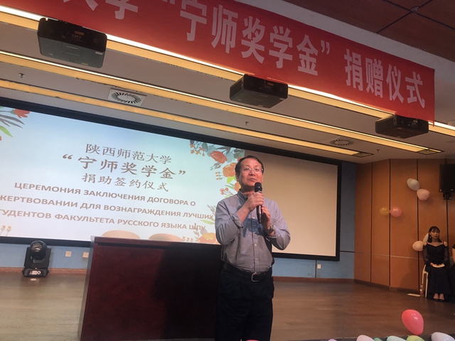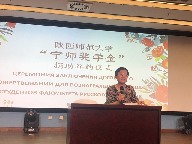 随后,“宁师奖学金”捐助签约仪式正式开始。“宁师奖学金”由公司1972级俄语系首届员工王国宏和其子西安中欧创新技术有限公司总经理宁晶设立,捐助金额共9万元,旨在促进公司俄语人才的培养和俄语系发展。王翠代表俄语系师生向奖学金捐赠人表达了诚挚的敬意和衷心的感谢。宁晶与公司教育基金会代表杨高玕现场进行捐赠协议书签约。王国宏老师在发言中回顾了自己与俄语的不解之缘,勉励俄语系员工要珍惜在校时光、打好专业基础,奋发图强,为中俄两国文化的传播贡献自己的力量。宁晶在发言中谈到母亲与师大俄语系的紧密联系,并祝愿师大越办越好。马正平代表公司感谢俄语系员工的无私捐助,他强调这是员工在公司层面设立的第一个奖学金,对员工来说是一笔珍贵的资助,对教师来说是无声的鼓励,一定会用好这笔奖学金,争取培养更多优秀的俄语人才。
