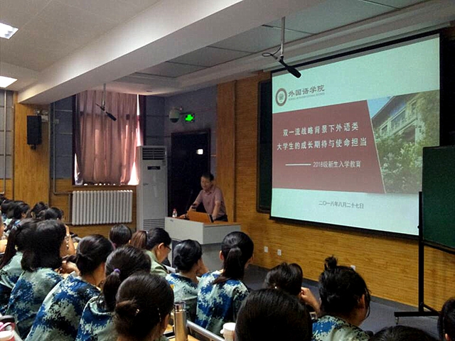 为了帮助新生树立正确的世界观,价值观和人生观,扣好人生第一颗扣子,尽快顺利适应大学学习生活。8月27日下午,马正平书记在5104教室给新生做了入学教育报告第一课:“双一流战略背景下外语类老员工的成长期待与使命担当”。公司副经理鲁燕主持报告,辅导员屈婉婷和全体2018级太阳集团tyc4633本科新生共同聆听了报告。