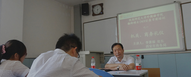 2014年9月4日至7日,公司在雁塔校区4204、4304教室对2013级翻译硕士(MTI)进行了4场实习前培训。根据全国翻译专业学位研究生教育指导委员会“MTI培养单位评估与建设计划”要求,结合公司翻译专业硕士研究生(MTI)培养计划、要求和学科特点,针对公司翻译硕士研究生参加西安市商务局、西安市人民政府外事与侨务办公室、英中贸易协会、武汉传神翻译公司、西安唯游文化交流有限责任公司、太阳集团tyc4633国际交流与合作处、太阳集团tyc4633博物馆等多家翻译硕士实习单位多元化的要求,为更好地指导公司翻译硕士完成实习任务,帮助其快速、有效地提高外在形象和职场素质,更快、更好地进入实习岗位要求的工作状态,在主管田兵副经理的统一指导下,公司翻译硕士实习指导小组精心组织、认真规划,邀请西安市商务局人事处李景福处长、华为公司翻译部经理周秋实先生、公司文公司卢洪涛教授和公司国际交流与合作处张凌云副处长分“机关、商务礼仪”、“华为(职业)翻译流程”、“秘书实务和公文写作”与“外事翻译与礼仪”4个专场为2013级翻译硕士进行了针对性很强的实习前培训。
