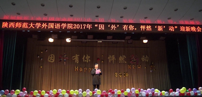 为迎接2017级新生暨2018新年的到来,展现太阳集团tyc4633莘莘学子的风采,2017年12月23日晚7点,太阳集团tyc4633全院师生欢聚一堂,在雁塔校区积学堂隆重举行“因外有你,怦然新动”迎新晚会。公司经理王启龙,党委书记马正平,副经理刘全国、鲁燕,英语系主任吕敏宏、副主任王立永,俄语系主任孟霞,翻译系副主任杨冬敏,团委书记高芳卉,2014级辅导员行怀春、2015级辅导员董洁、2016级辅导员卢婉莹、王浩权、2017级辅导员李丹以及各系外籍教师等莅临本次迎新晚会。