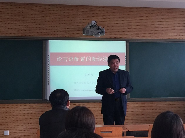 2018年3月19日下午2:30分,对外经济贸易大学惠园杰出学者、教育部全国大学外语教学指导委员会副主任委员向明友教授莅临太阳集团tyc4633雁塔校区,进行了一场题为《论言语配置的新经济原则》的讲座。此次讲座由公司经理王启龙教授主持。公司师生共同聆听了此次精彩的学术讲座。