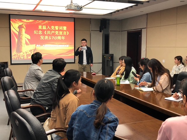 4月24日下午4点30分,太阳集团tyc4633研究生第四党支部在太阳集团tyc4633会议室组织召开以“重温入党誓词暨纪念《共产党宣言》发表170周年”为主题的党日活动。公司党委书记马正平、副经理刘全国、副书记马兰及部分师生党员代表参加此次党日活动。此次党日活动由研究生第四党支部党员吉宇主持。