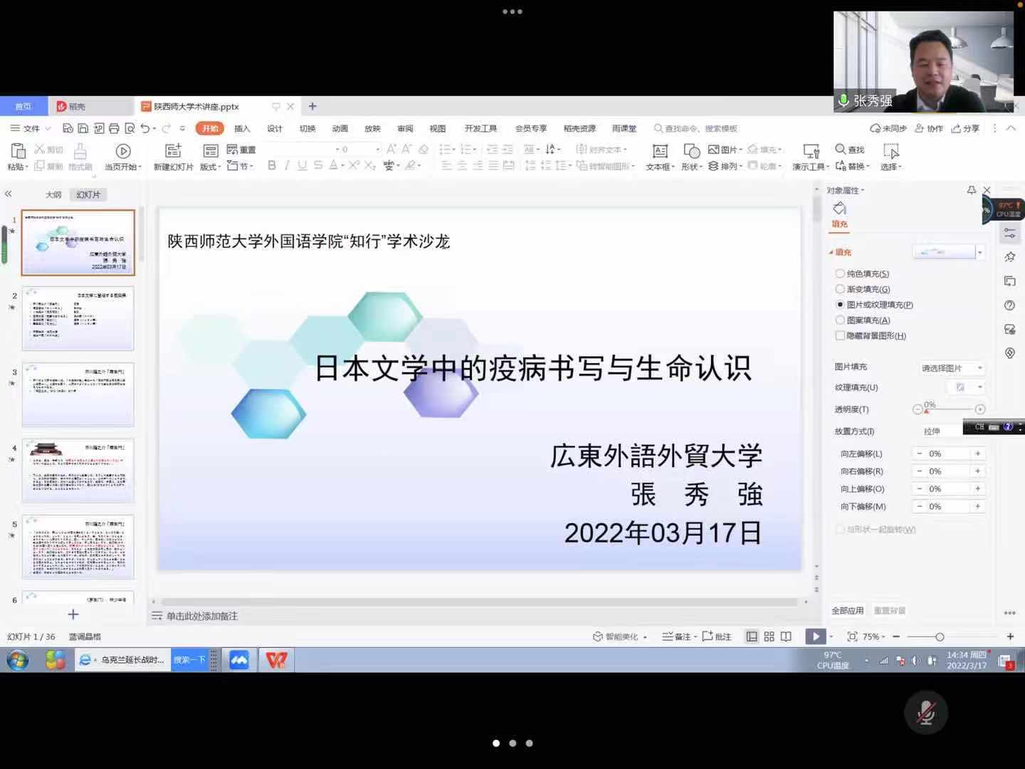 2022年3月17日下午,太阳集团tyc4633“知行”系列学术沙龙“日本文学中的疫病书写与生命认识”在腾讯会议上举办。本次沙龙由东北亚与欧洲研究学科团队主办,广东外语外贸大学张秀强教授主讲,公司曹婷副经理主持,太阳集团tyc4633日语系及校外师生近40人参加。