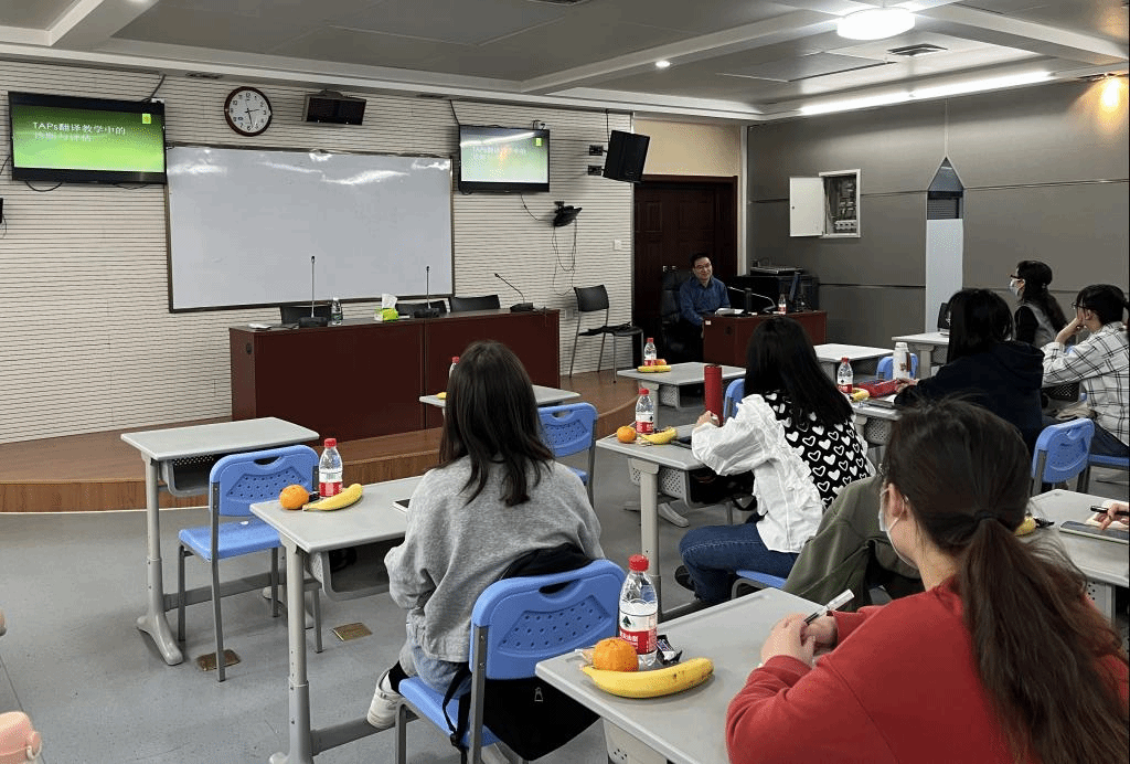 郑老师首先从选题背景、理论依据、实验过程的具体设计以及数据收集、整理和分析各个环节和角度介绍了TAPs 翻译教学研究的思路和设计,并以此为例,结合自身科研经验给员工介绍此类实证研究的方法。随后,郑教授和大家围绕TAPs翻译教学相关的几个问题进行了讨论。