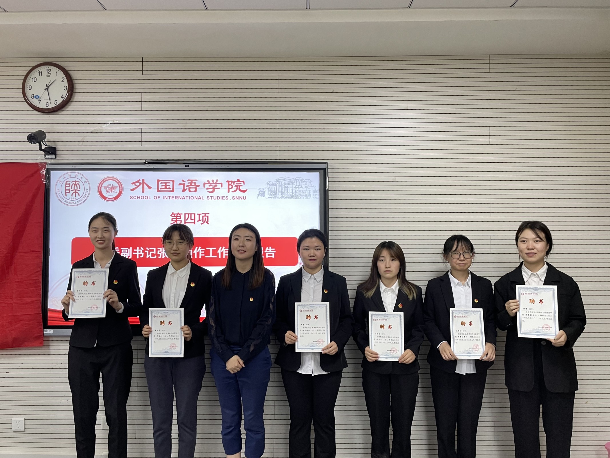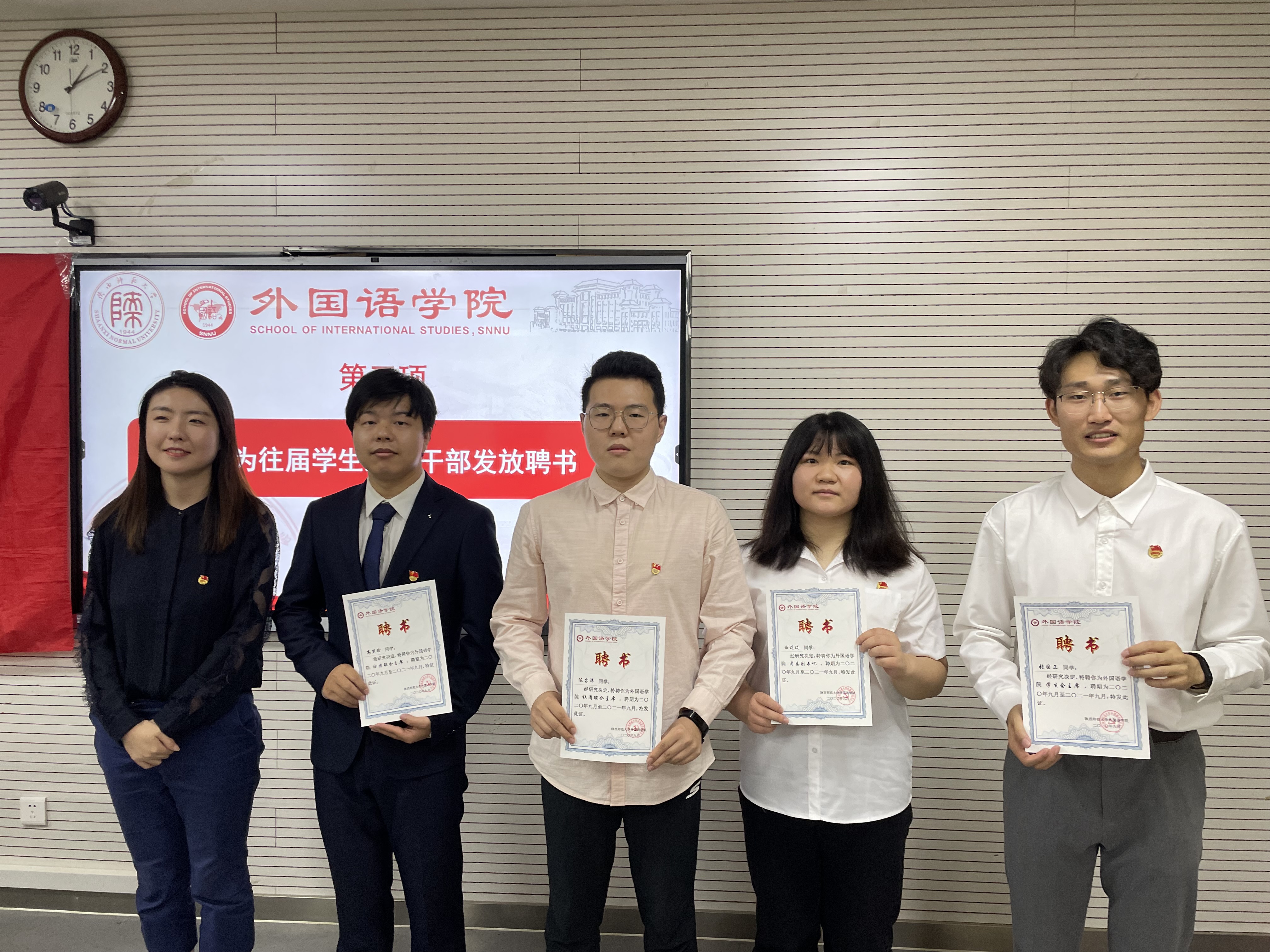 李丹为往届员工组织干部张国正、曲辽辽、陈召洋、高楚晗发放聘书,肯定他们在任期间的优秀工作,希望他们在毕业之后到更广阔的舞台施展才能、成就自我。