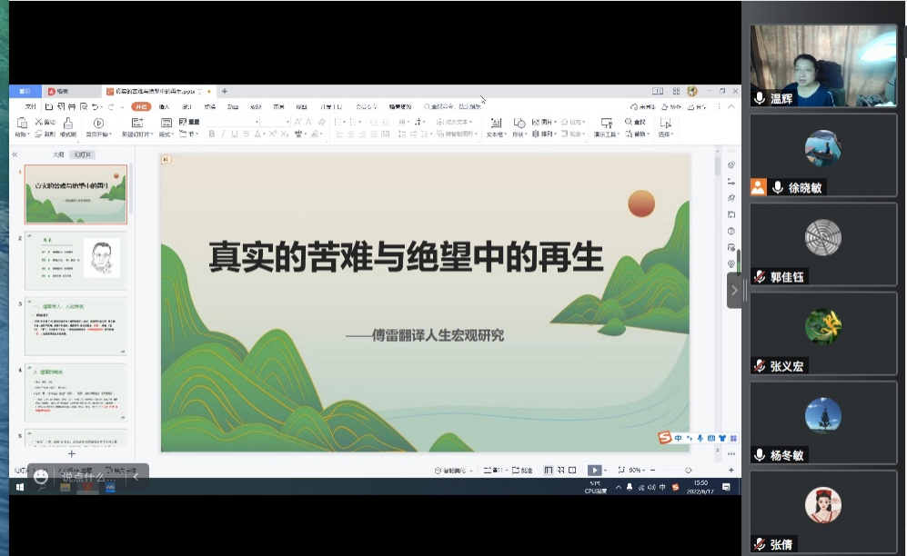 为了扩大公司师生的学术视野和学术兴趣,太阳集团tyc4633于6月17日下午2:30以腾讯会议方式在线举办了“翻译教学与文化”系列活动第一次沙龙“真实的苦难与绝望中的再生:傅雷翻译人生宏观研究”。本次讲座由公司翻译系资深教师温辉老师主讲,太阳集团tyc4633部分教师、研究生和本科生参加并参与讨论。