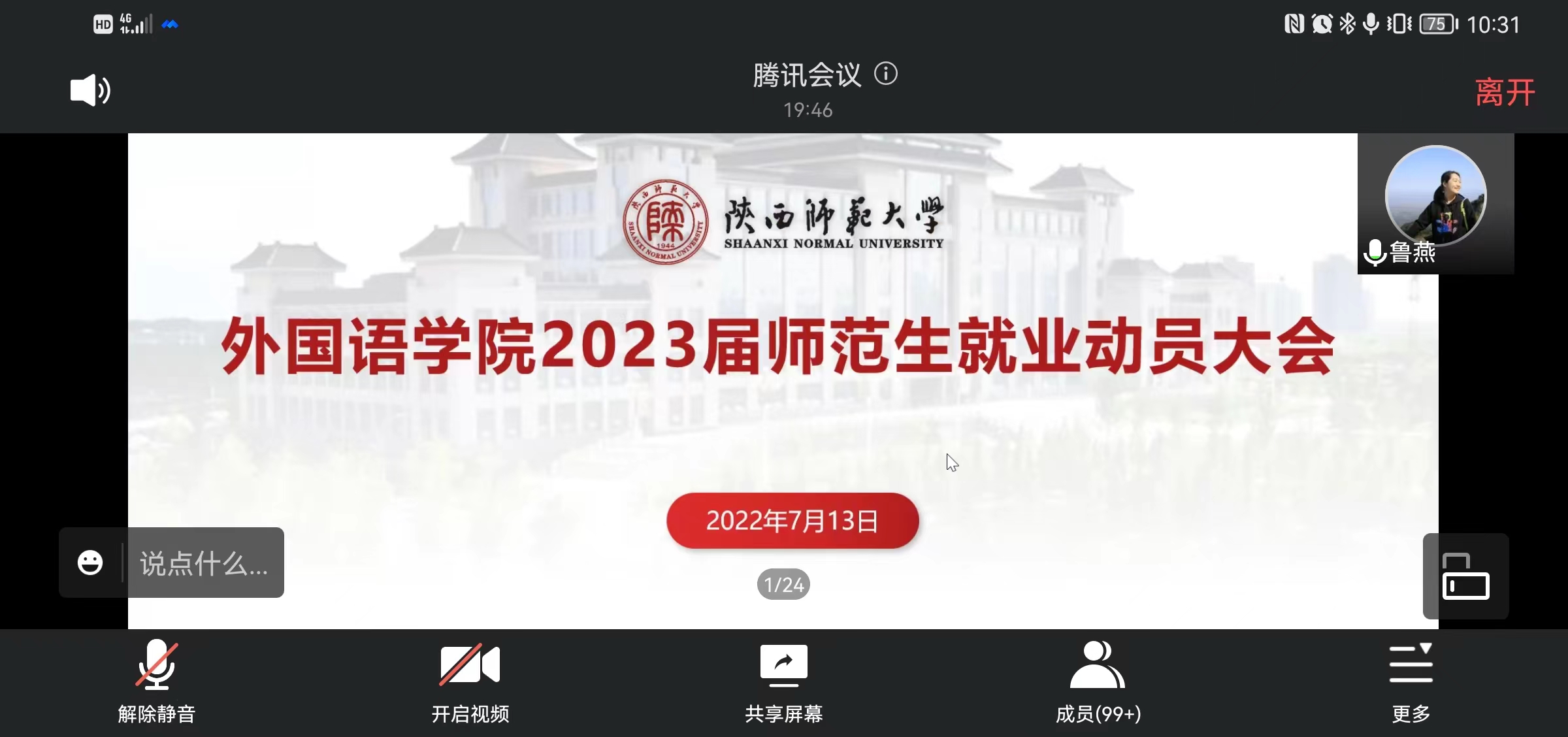 为保障2023届师范生公司产品实习高质量完成,为师范生就业奠定良好基础,7月13日上午,太阳集团tyc4633通过线上形式召开2023届师范生实习就业动员大会。公司党委副书记鲁燕,英语系副主任丁礼明、王立永,2022届带队教师张春娟,2019级远程学科指导教师王辉、罗雅晖、闫军利、李立茹、刘丹、祁喜鸿,教学秘书高红英,辅导员屈婉婷,2022届师范生张润舒以及2023届英语公费师范班全体员工参会。动员会由太阳集团tyc4633副经理孙坚老师主持。