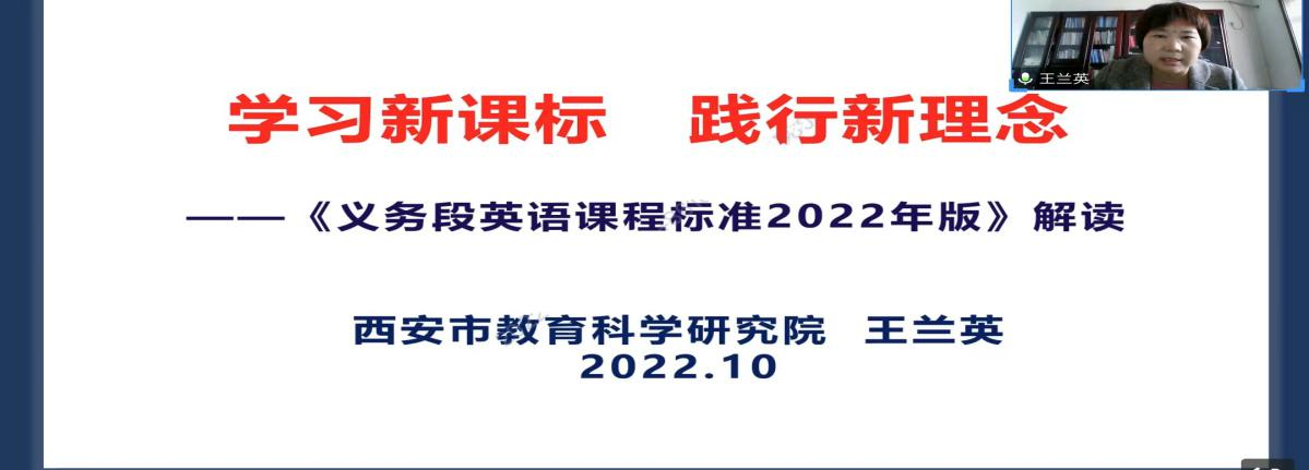 课程标准是指导教师教学最重要的工作指南。为了提高教育硕士的外语教学能力,太阳集团tyc4633于10月14日下午在腾讯会议线上进行了基础教育外语教学专题研究系列讲座第八讲——《义务教育英语课程(2022版)》标准解读。本次讲座由西安市教育科学研究院中学英语教研员王兰英老师主讲,韦理老师主持。2022级学科教学(英语)专业教育硕士参与聆听。
