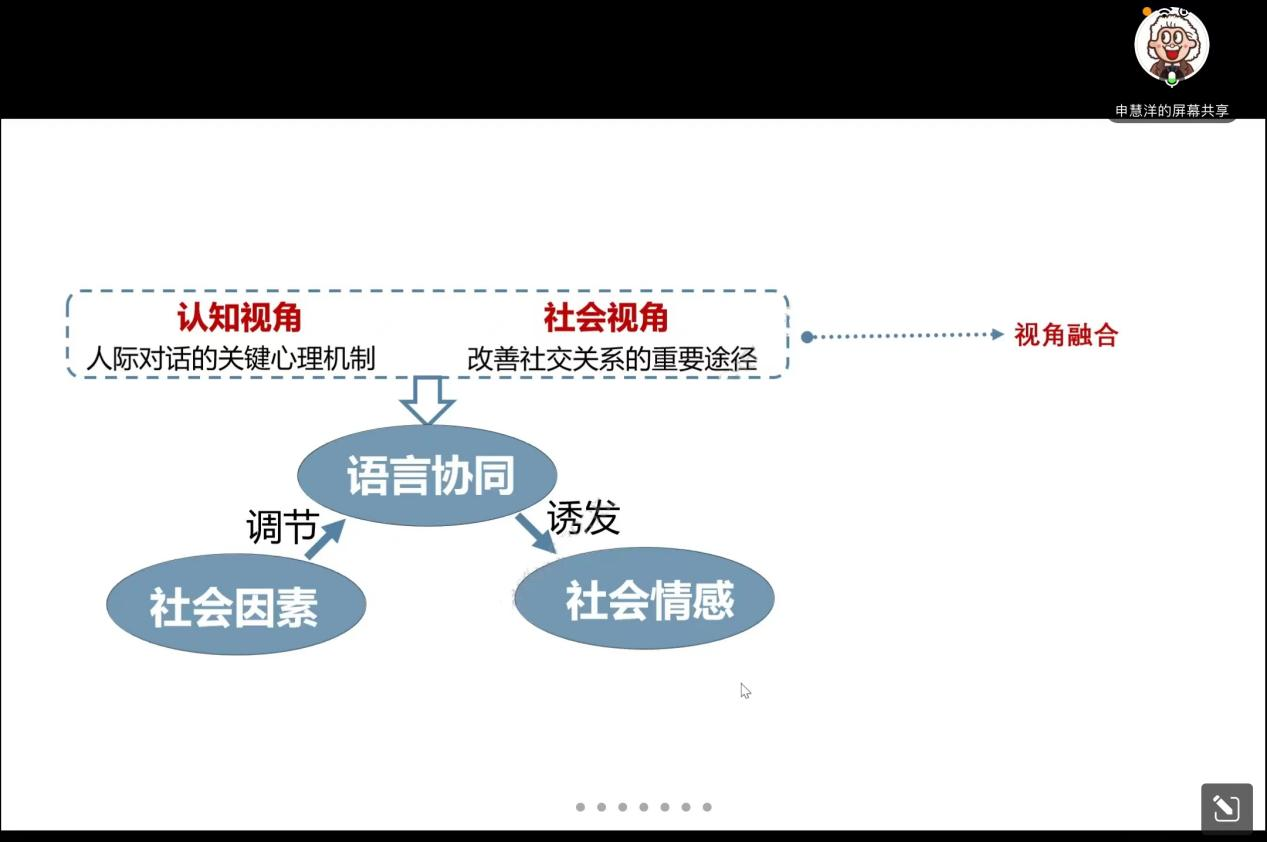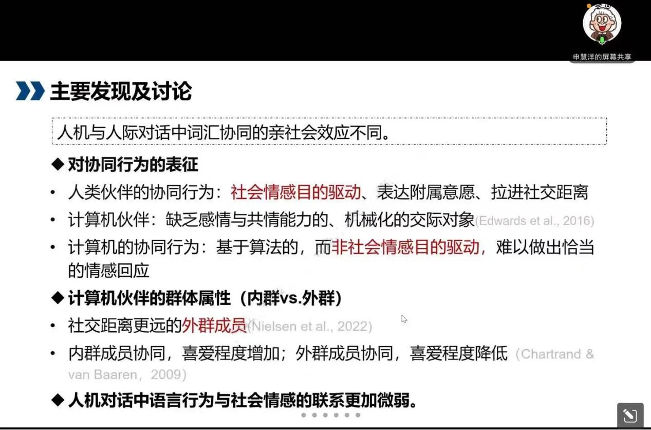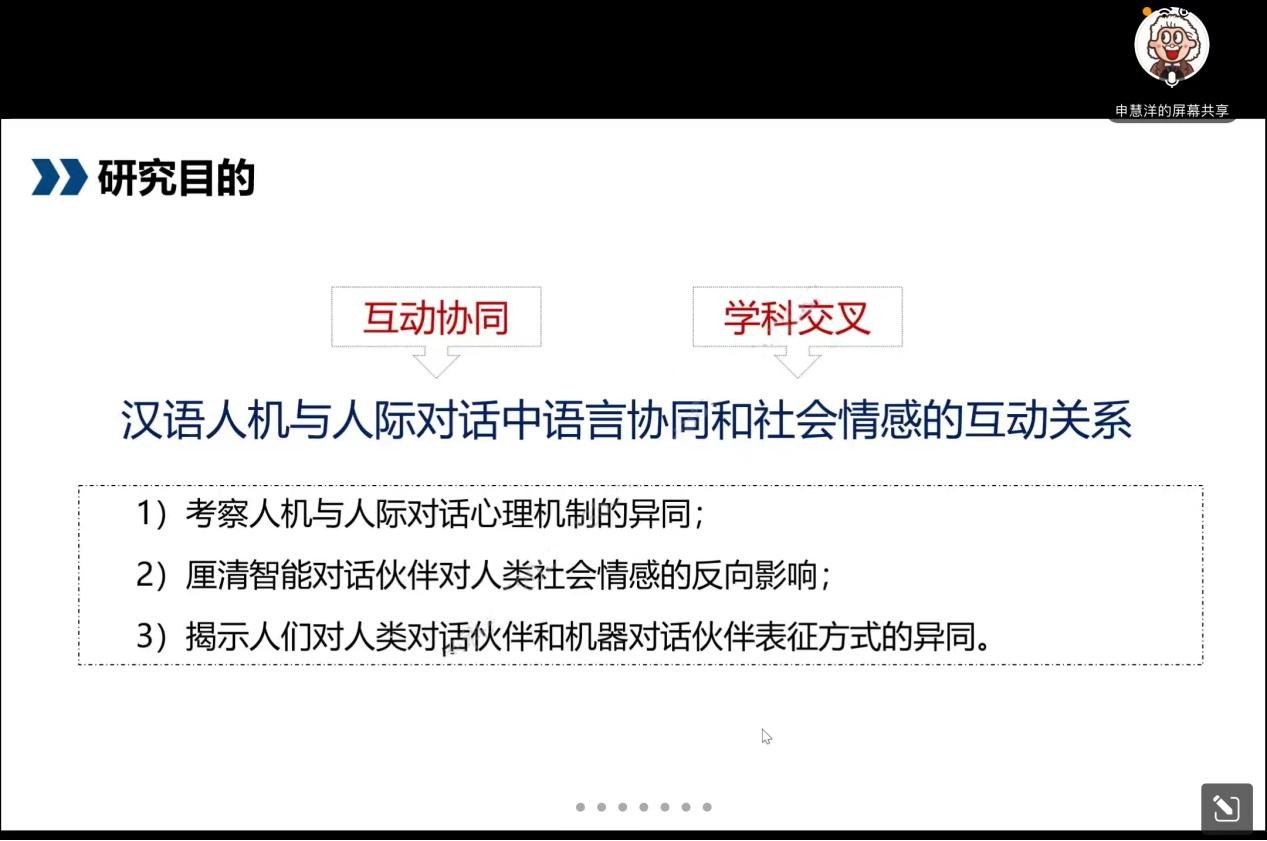 接着老师向大家介绍了该研究的目的主要是为了探讨人机与人际对话中语言协同和社会情感的互动关系,考察人机与人际对话心理机制的异同,厘清智能对话伙伴对人类社会情感的反向影响,并揭示人们对人类对话伙伴和机器对话伙伴表征方式的异同。