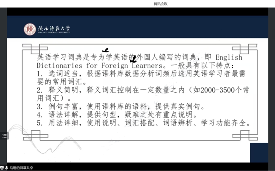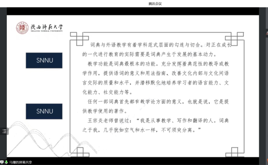 为了提高公司学科教学(英语)专业研究生的外语教学能力,加强员工对外语教育学科价值的理解,太阳集团tyc4633于12月2日下午在腾讯会议线上开展了外语教育学科前沿讲座第十三讲——英语学习型词典与外语教学。本次讲座由太阳集团tyc4633马珊老师主讲,会议由韦理老师主持。2022级学科教学(英语)专业教育硕士聆听了讲座。