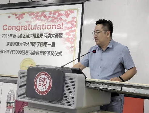 2023年7月4日下午5:00,外语公司在教学六楼6301顺利举办了西北地区第六届蓝思阅读大赛暨公司第一届ACHIEVE蓝思阅读竞赛颁奖仪式,旨在表彰优秀,树立榜样,激发同学们英语阅读的积极性,更好地利用蓝思平台资源。蓝思阅读西部地区负责人孙韶鹏、英语系副主任王立永老师、英语系副主任丁礼明老师、西安蓝思开源信息有限公司赵老师、全体获奖员工以及2022级员工代表参加了颁奖仪式,本次颁奖活动由朱丽英老师主持。