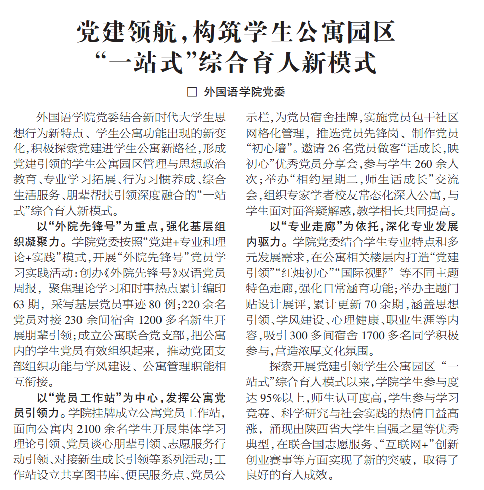 《陕西师大报》677期第三版以《党建领航,构筑员工公寓园区“一站式”综合育人新模式》为题专题报道公司党建亮点项目。