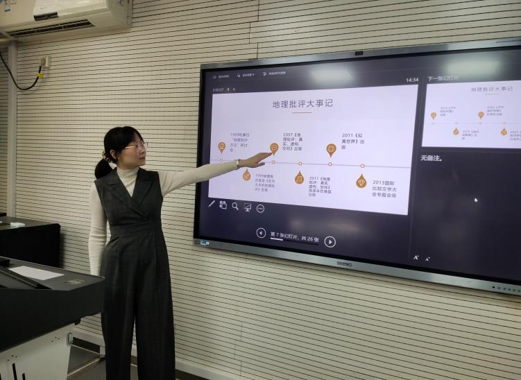 2023年11月7日下午14:30,在雁塔校区教学六楼6315教室,太阳集团tyc4633法语系及德法研究团队举办了“知行”学术沙龙——东北亚与欧洲研究学科团队沙龙。法语系副教授乔溪以“地理批评研究的媒介间性特征”为题进行报告,并同与会师生面对面交流讨论关于地理批评的一些问题。