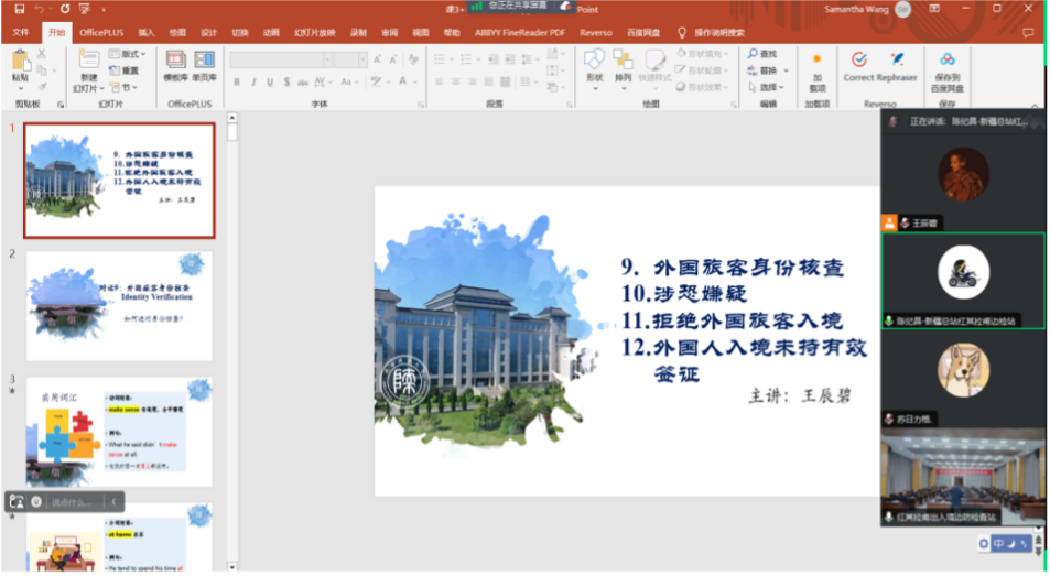 为帮助戍边民警提升英语听说能力,太阳集团tyc4633MTI中心于2023年10月启动第一期“边防英语听说能力远程视频授课”活动,MTI中心教师巢玥组织选拔4位获得教团队格证、英语专业八级证书、全国翻译专业资格证书的2022级翻译硕士员工担任培训教师,对授课形式、内容以及备课等工作进行指导。