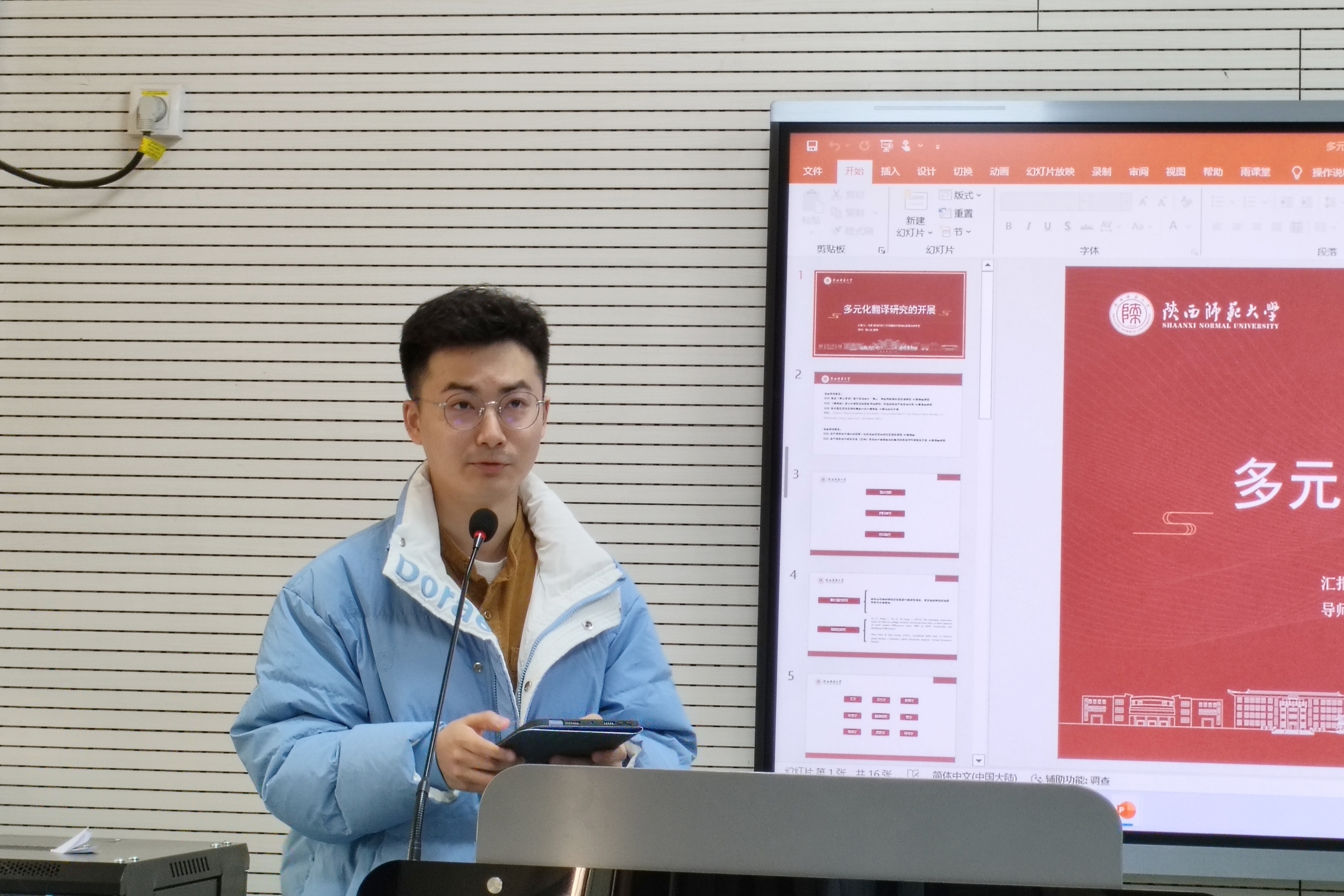 邓林以《多元化翻译研究的开展》为题进行汇报,主要从个人的翻译研究心得体会进行分享。邓林认为在学术探索阶段不必局限于既定的研究主题或学科框架,应该积极根据个人兴趣了解翻译学研究的研究热点,学习翻译学学科研究的研究范式。