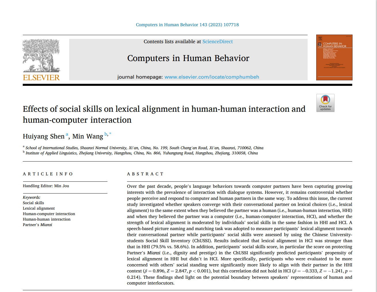 成果名称:Effects of social skills on lexical alignment in human-human interaction and human-computer interaction