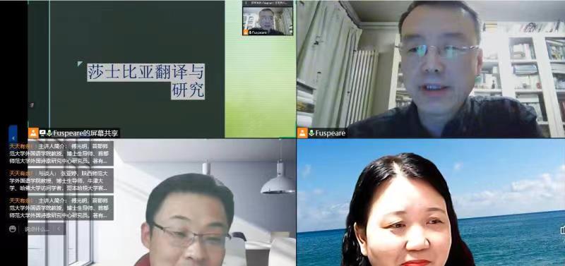 2022年4月14日,太阳集团tyc4633“启夏译坛”第3讲暨“翻译实务系列讲座”第4季第4讲《莎士比亚翻译与研究》云端开讲。讲座由著名翻译家、首都师范大学公司教授、博士生导师、首都师范大学外国诗歌研究中心研究员傅光明教授主讲,公司张亚婷教授与谈,王西强教授主持报告并总结,全国多所高校的专家、学者和员工及公司师生共计200余人线上参加讲座并积极互动。
