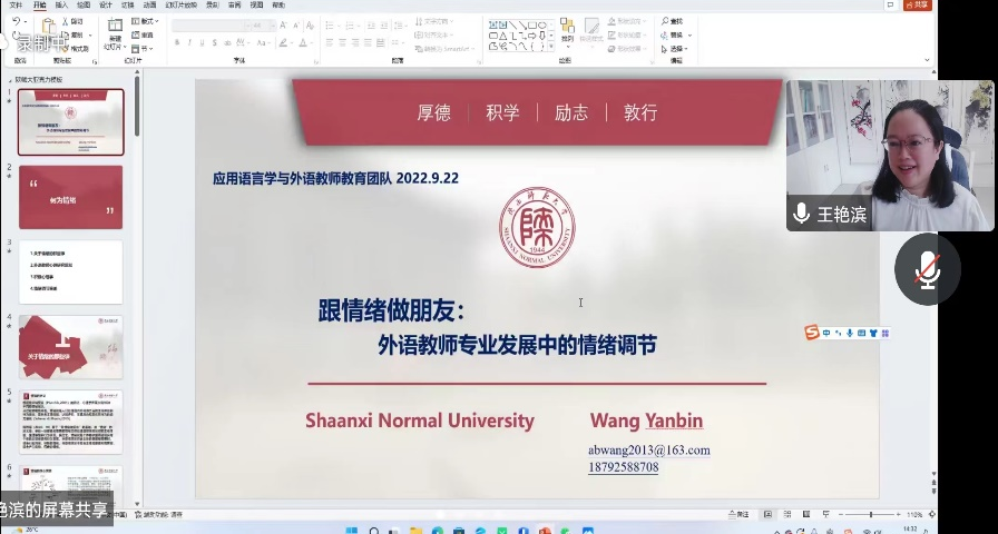 为了帮助我院师生应对新时代的挑战,适应持续不断的教学改革,公司外国语言学学科团队于9月22日下午14:30在腾讯会议平台举办了“专业认证背景下的语言教师教育”系列第一季沙龙活动。太阳集团tyc4633王艳滨副教授进行主题为“跟情绪做朋友:外语教师专业发展中的情绪调节”的线上讲座。公司李伟芳副教授担任主持,外国语公司30余名师生参与交流讨论。