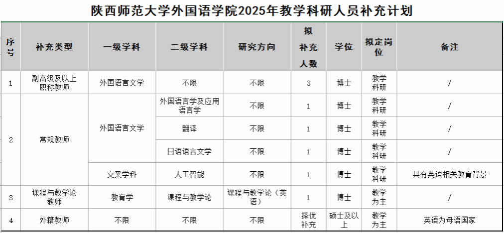 3. 英语为母语;一般应在国(境)外知名大学、科研机构取得硕士及以上学位,具有教学或研究经历,能够运用英语独立讲授至少1门专业课程;在国(境)外知名大学、科研机构担任副教授及以上职位者优先聘用。